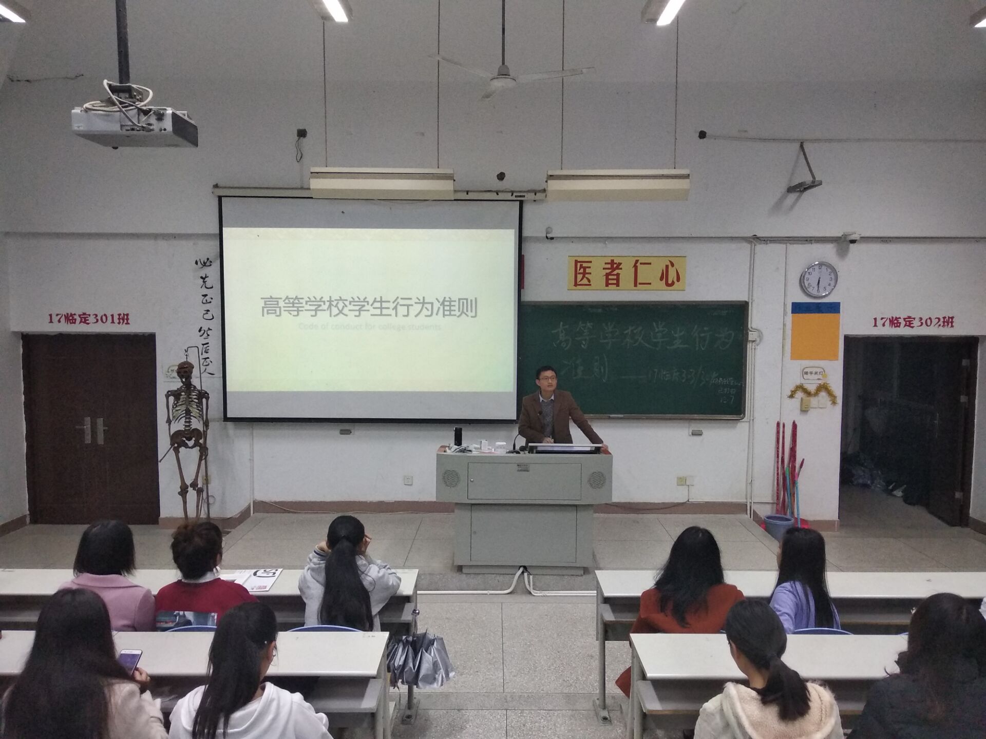 為更好地規(guī)范學(xué)生的日常行為,培養(yǎng)學(xué)生良好的學(xué)習(xí)習(xí)慣、生活習(xí)慣、行為習(xí)慣,形成良好的校紀(jì)校風(fēng)和班風(fēng),臨床醫(yī)學(xué)系于2018年12月9日晚組織各班級(jí)開(kāi)展學(xué)習(xí)《高等學(xué)校學(xué)生行為準(zhǔn)則》主題班會(huì)。