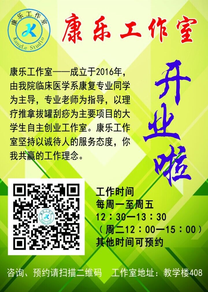 為培養(yǎng)大學生創(chuàng)業(yè)意識,激發(fā)大學生創(chuàng)業(yè)熱情,提高大學生創(chuàng)業(yè)能力,在學院、系部各級領(lǐng)導的關(guān)心支持下,我系康復專業(yè)同學主創(chuàng)的康樂工作室,于2016年11月23日在教學樓408正式開業(yè)。