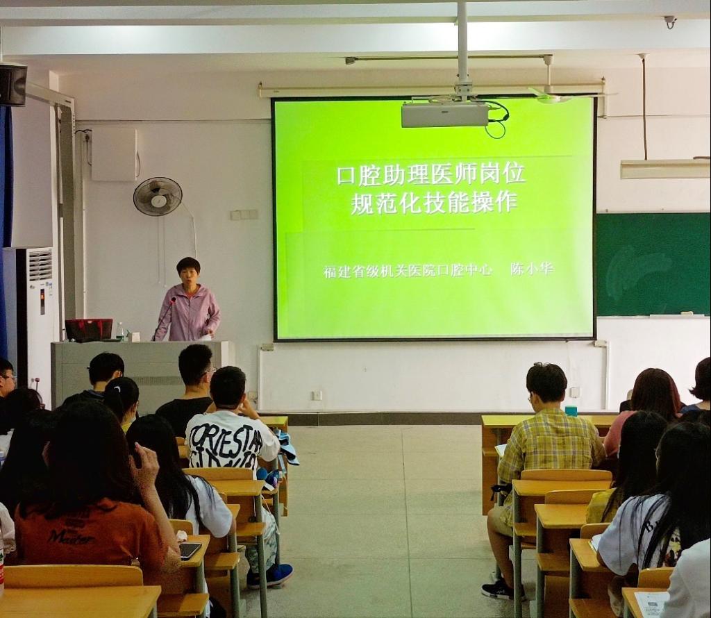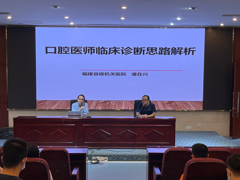 5月23日,應(yīng)醫(yī)學(xué)系邀請(qǐng),附屬醫(yī)院福建省級(jí)機(jī)關(guān)醫(yī)院副院長(zhǎng)、國(guó)際牙科醫(yī)師學(xué)院院士(ICD)、福建省口腔質(zhì)量控制中心副主任潘在興教授,附屬醫(yī)院口腔中心副主任陳小華主任醫(yī)師到校為即將畢業(yè)的2018級(jí)口腔醫(yī)學(xué)專業(yè)學(xué)生分別做了《口腔臨床醫(yī)師診斷思路解析》、《口腔助理醫(yī)師崗位規(guī)范化技能操作》專題講座,醫(yī)學(xué)系邱滾忠書記、林國(guó)威副主任、林浩副主任、口腔教研室全體教師也一起到場(chǎng)聆聽了報(bào)告。