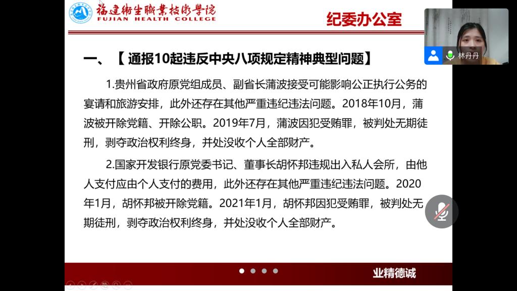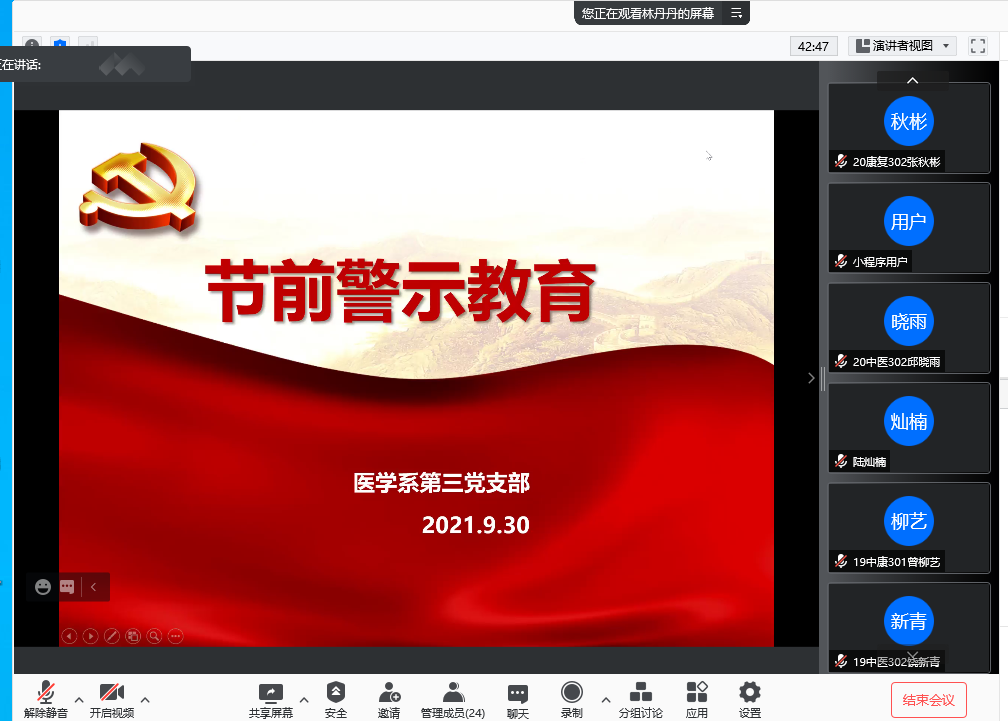 在2021年國慶節(jié)即將來臨之際,為增強支部黨員廉潔自律意識,營造風清氣正的節(jié)日氛圍,2021年9月30日晚,醫(yī)學(xué)系第三黨支部開展“節(jié)前警示教育”。此次會議由支部紀檢委員、組織委員林丹丹主持,支部黨員教師們積極參加。