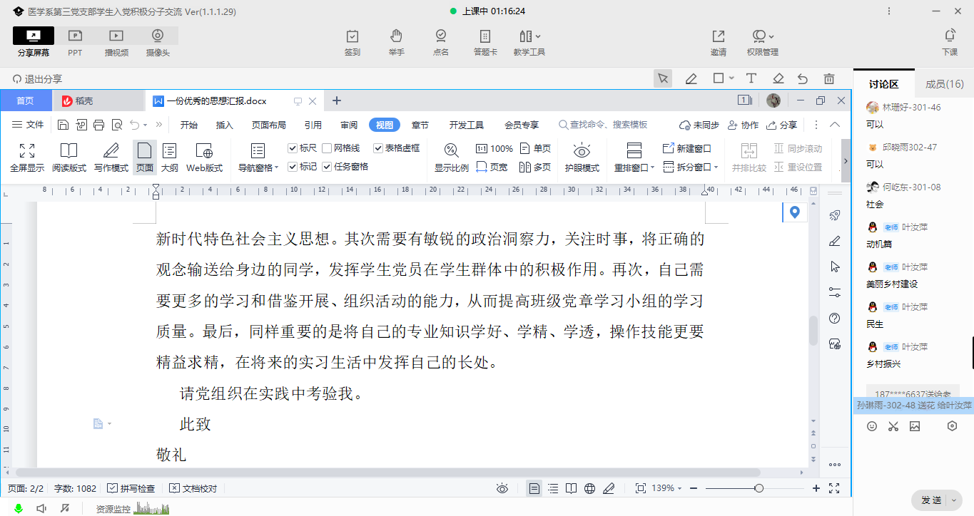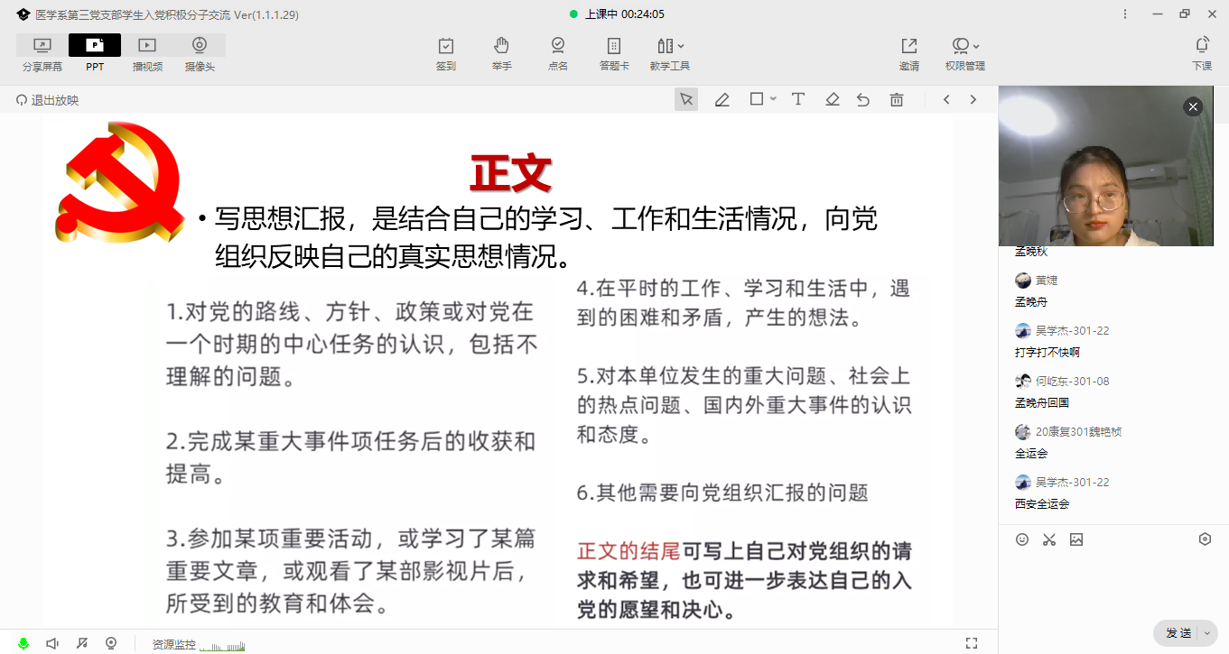 為提高入黨積極分子的思想政治素質,切實保證新發(fā)展黨員質量,2021年9月27日晚,醫(yī)學系第三黨支部副書記葉汝萍利用騰訊課堂為19級(在實習)、20級(在校)入黨積極分子們在線開展思想匯報撰寫培訓。