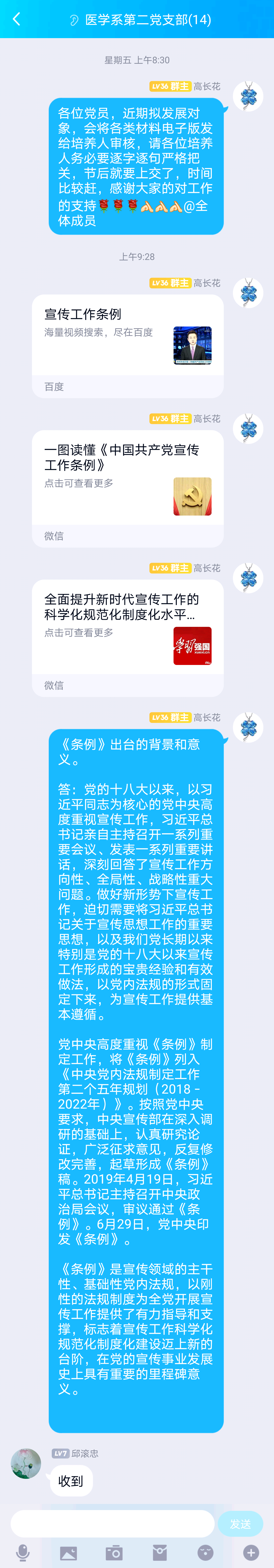 為提高全體黨員的政治意識和宣傳工作水平,2月8日上午,醫(yī)學(xué)系第二黨支部組織全體黨員在線專題學(xué)習(xí)了《中國共產(chǎn)黨宣傳工作條例》(以下簡稱《條例》),學(xué)習(xí)活動由支部書記高長花同志主持。