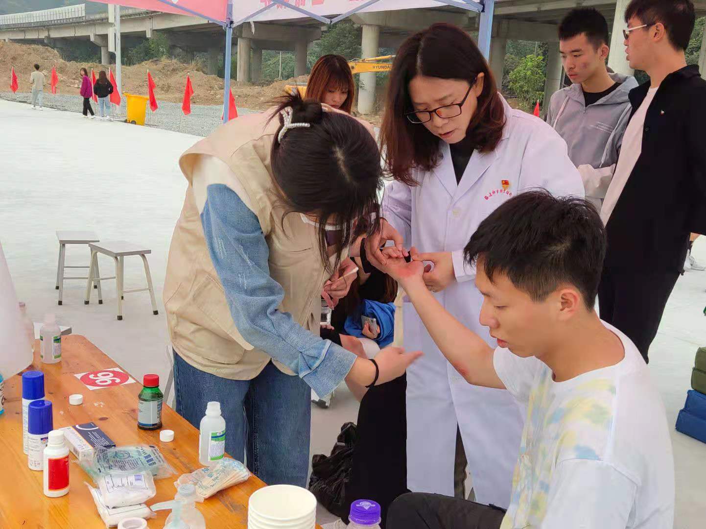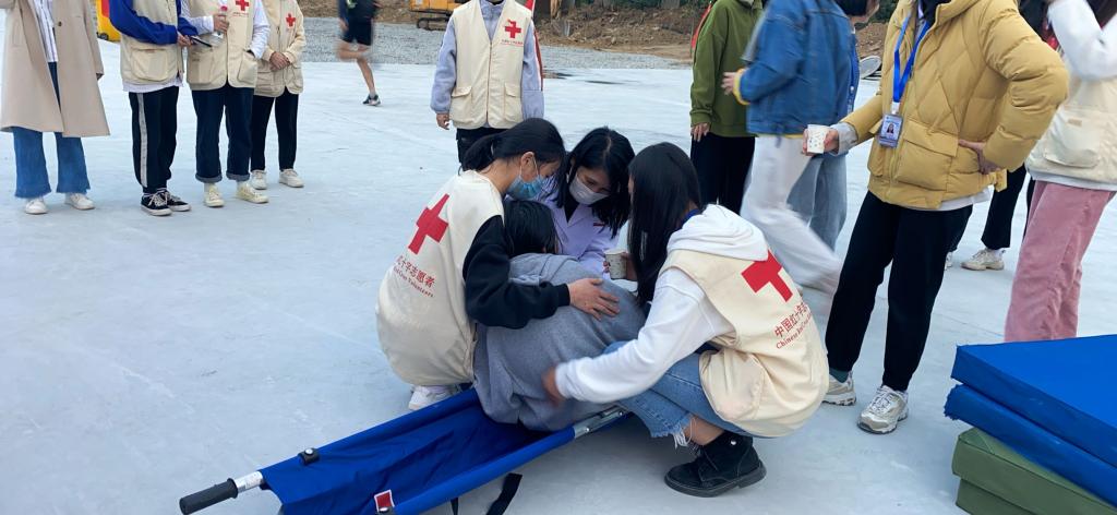 比賽開始前,醫(yī)療隊(duì)黨員教師及紅十字志愿者指導(dǎo)運(yùn)動員進(jìn)行賽前放松運(yùn)動;賽中出現(xiàn)傷員時(shí),及時(shí)為他們清洗、包扎傷口,并提醒注意事項(xiàng)。比賽期間,準(zhǔn)備好裝有繃帶、紗布、碘伏、50%葡萄糖等數(shù)種藥物的紅十字急救箱守護(hù)在賽場旁。運(yùn)動會為期3天,醫(yī)療隊(duì)全程陪伴在運(yùn)動員身邊,為賽事安全保駕護(hù)航。
