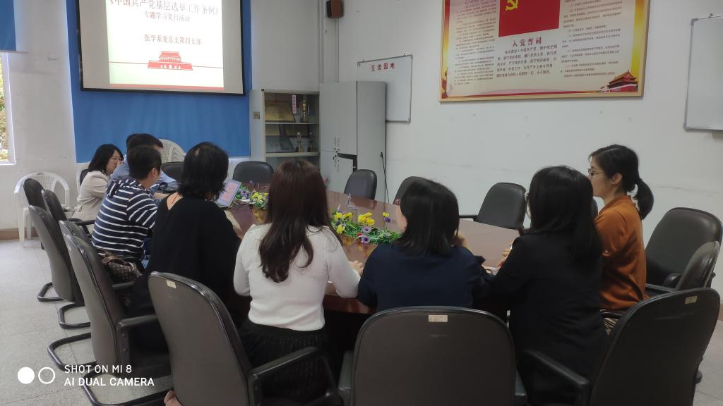 11月26日,醫(yī)學(xué)系第四黨支部在醫(yī)學(xué)基礎(chǔ)部會議室開展《中國共產(chǎn)黨基層組織選舉工作條例》專題學(xué)習(xí)黨日活動。醫(yī)學(xué)系第四黨支部書記鄧元榮同志主持,支部全體黨員參加了本次專題學(xué)習(xí)。