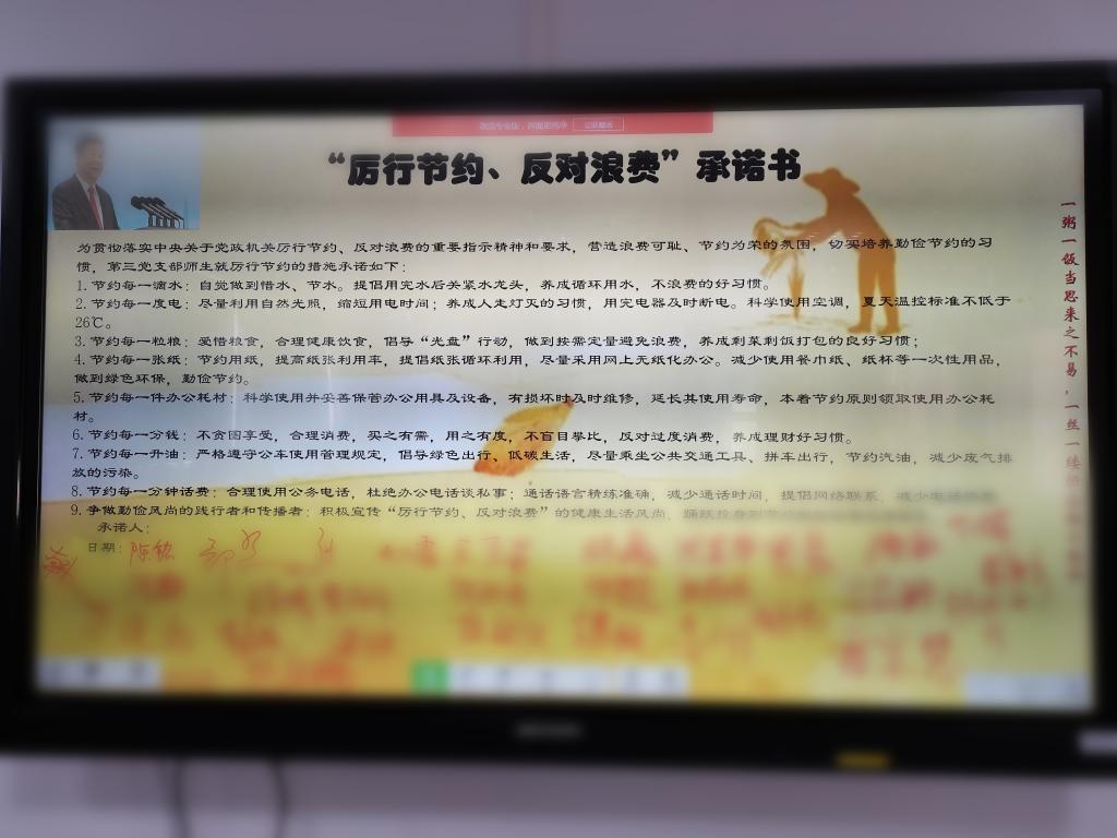 活動(dòng)前,支部書(shū)記陳銘同志指出,此次活動(dòng)特別選用了電子承諾書(shū),就是為了踐行活動(dòng)主題,真正做到不浪費(fèi)一張紙;同時(shí),他還強(qiáng)調(diào)勤儉節(jié)約是我國(guó)的傳統(tǒng)美德,我們應(yīng)身體力行,從小事做起:節(jié)約每一滴水、每一度電、每一粒糧、每一件辦公耗材、每一分錢(qián)、每一升油、每一分鐘話費(fèi),爭(zhēng)做勤儉風(fēng)尚的踐行者和傳播者,積極宣傳“厲行節(jié)約、反對(duì)浪費(fèi)”的健康生活風(fēng)尚,踴躍投身到節(jié)約型校園建設(shè)活動(dòng)中。