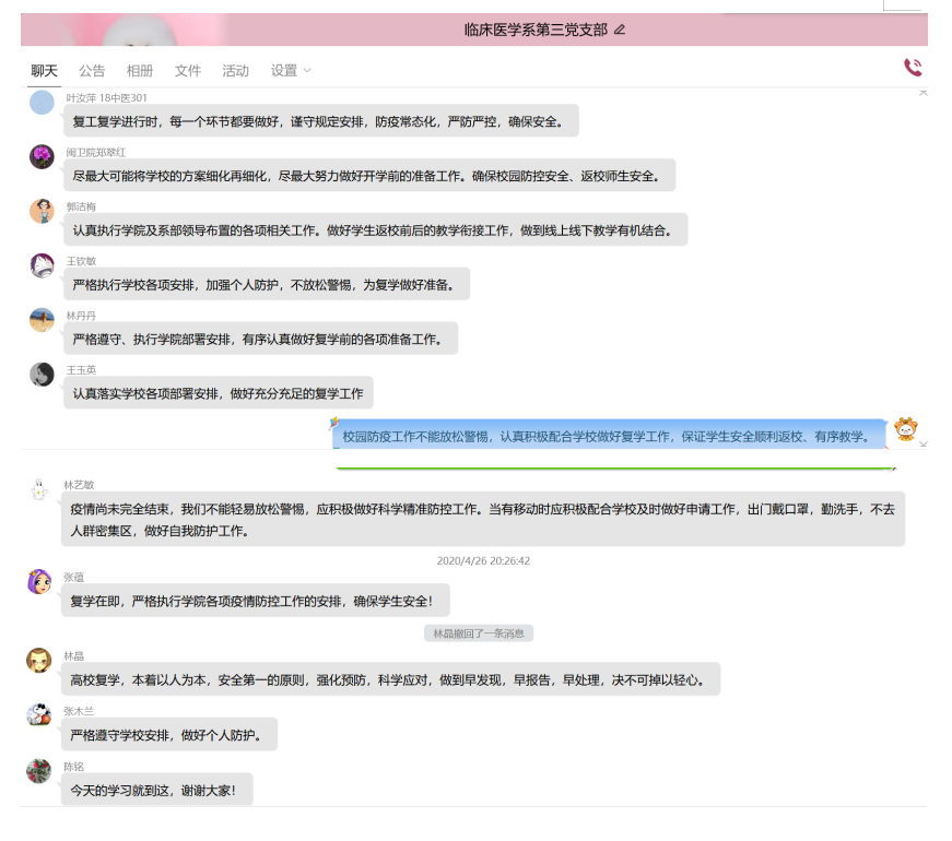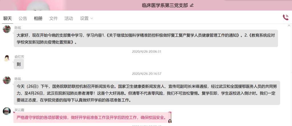 為有序推進學(xué)生返校復(fù)學(xué)準備工作,切實提升應(yīng)對突發(fā)疫情的應(yīng)急處置能力,4月26日晚,臨床系第三黨支部于線上開展《關(guān)于繼續(xù)加強科學(xué)精準防控積極做好復(fù)工復(fù)產(chǎn)復(fù)學(xué)人員健康管理工作的通知》及《教育系統(tǒng)應(yīng)對學(xué)校突發(fā)新冠肺炎疫情處置預(yù)案》學(xué)習(xí)活動。此次活動由支部書記陳銘同志主持,支部全體黨員及預(yù)備黨員均參加。