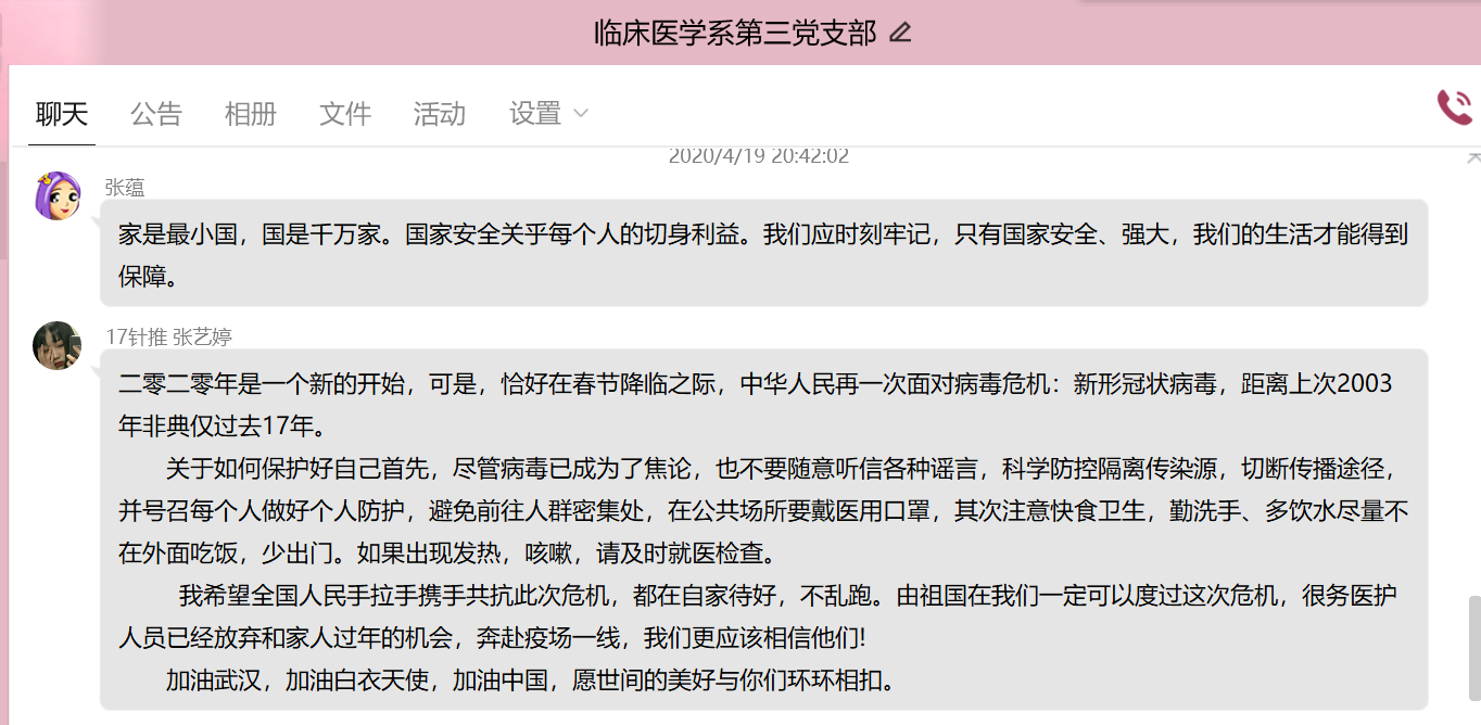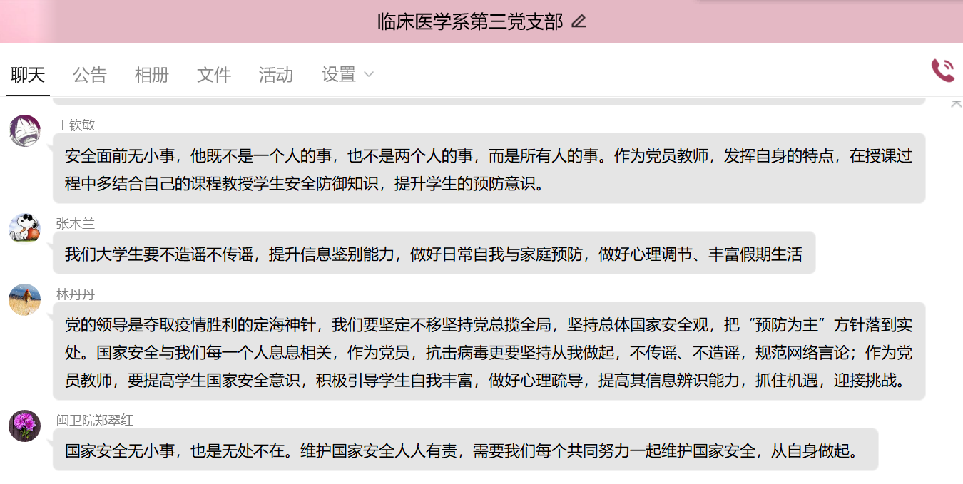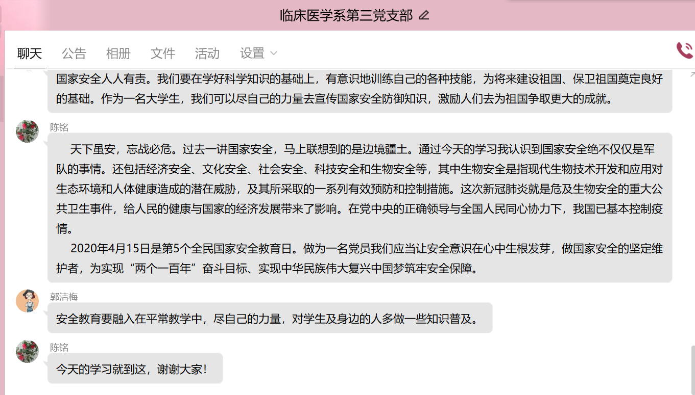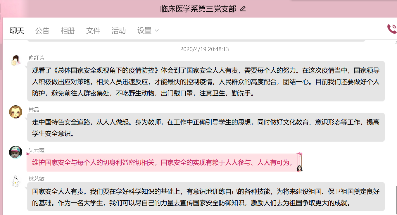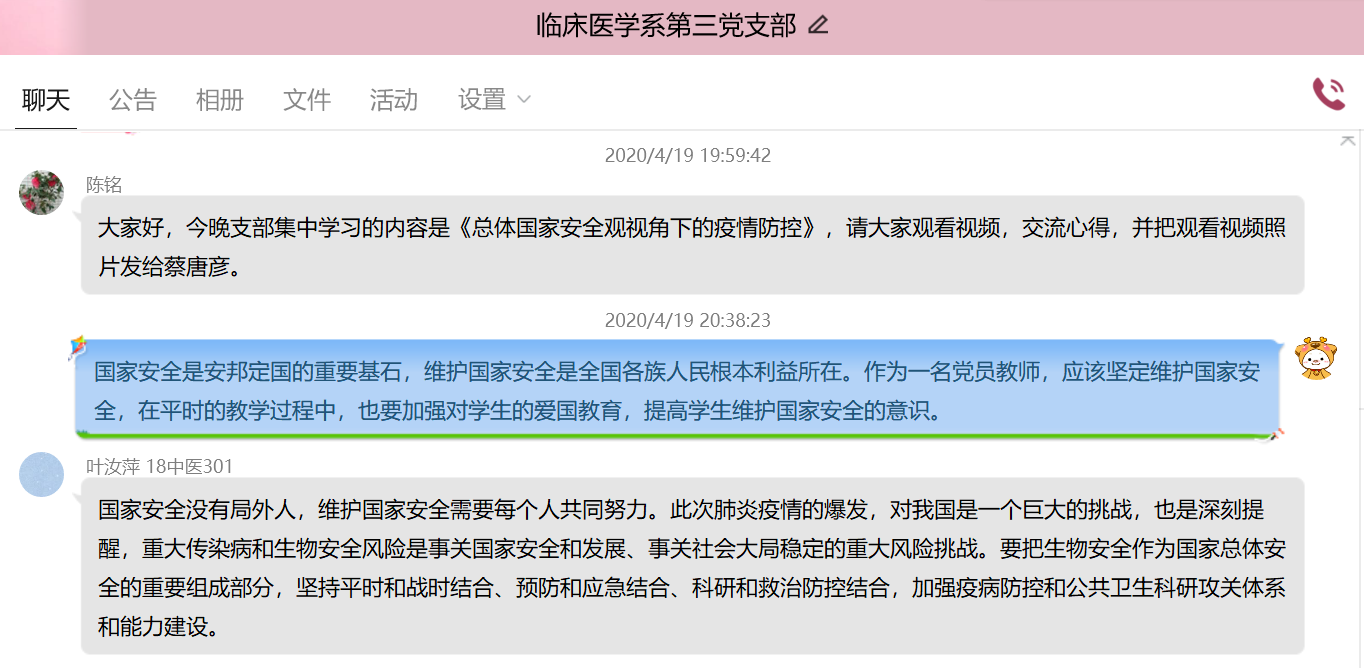 2020年4月15日是第5個全民國家安全教育日,今年的主題為“堅持總體國家安全觀,統(tǒng)籌傳統(tǒng)安全和非傳統(tǒng)安全,為決勝全面建成小康社會提供堅強保障”。為全面踐行總體國家安全觀,增強黨員國家安全意識,自覺維護國家安全,臨床醫(yī)學系第三黨支部在4月19日晚上開展線上觀看《總體國家安全觀視角下的疫情防控》視頻學習活動。此次活動由支部書記陳銘同志主持,支部全體黨員及預備黨員參加。
