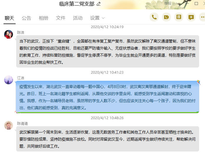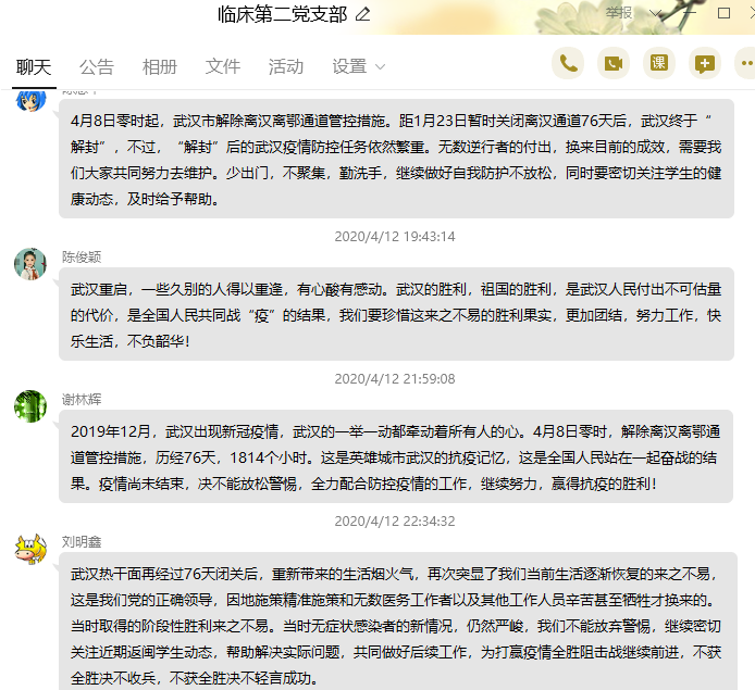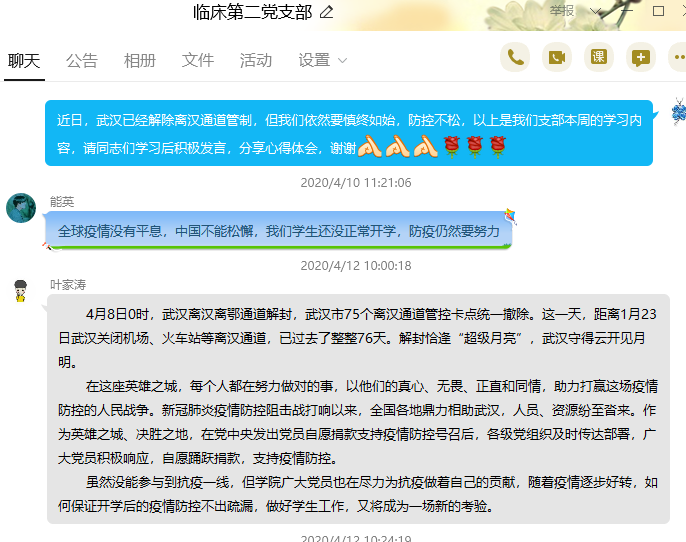 2020年4月12日,臨床醫(yī)學(xué)系第二黨支部組織全體黨員在線學(xué)習(xí),關(guān)于武漢解除管制措施,一起回顧了關(guān)閉離漢通道76個日日夜夜武漢人民的默默堅守和勇敢付出,和戰(zhàn)疫期間一線工作英雄們的先進(jìn)事跡,以及關(guān)閉離漢通道76天后,積極戰(zhàn)疫取得階段性勝利的第一周,逐步蘇醒的武漢煙火氣等,展開交流學(xué)習(xí)。黨員同志們積極發(fā)表自己的見解,就當(dāng)前國際疫情形勢仍然嚴(yán)峻的情況下,工作開展應(yīng)該注意的事項進(jìn)行交流學(xué)習(xí)。