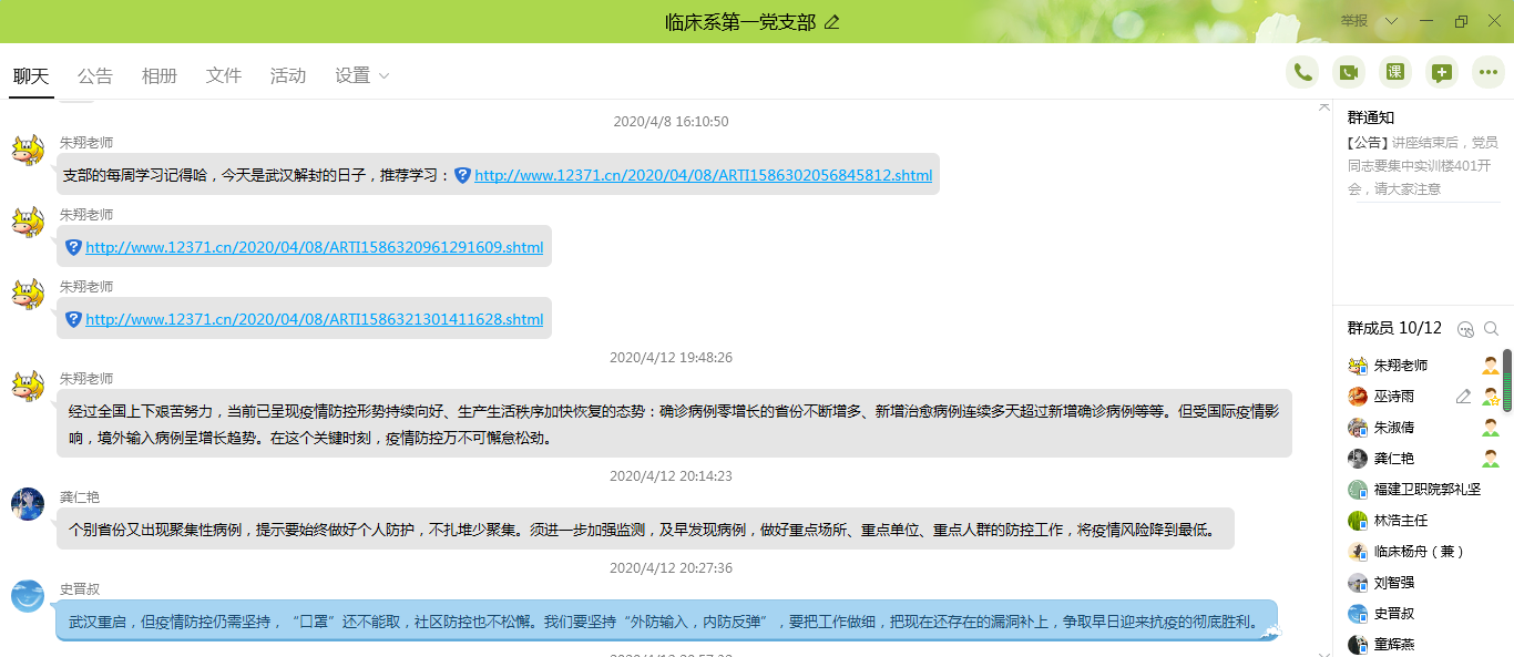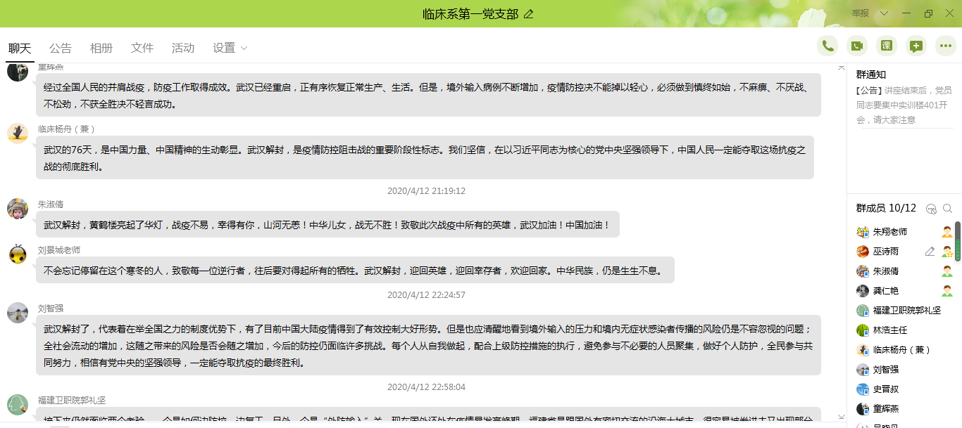 4月8日零時(shí)起,關(guān)閉離漢通道76天后,武漢市解除離漢離鄂通道管控措施。當(dāng)天,臨床醫(yī)學(xué)系第一黨支部組織在線(xiàn)學(xué)習(xí)了武漢解封的相關(guān)新聞和信息,并紛紛發(fā)表了自己的學(xué)習(xí)體會(huì)。