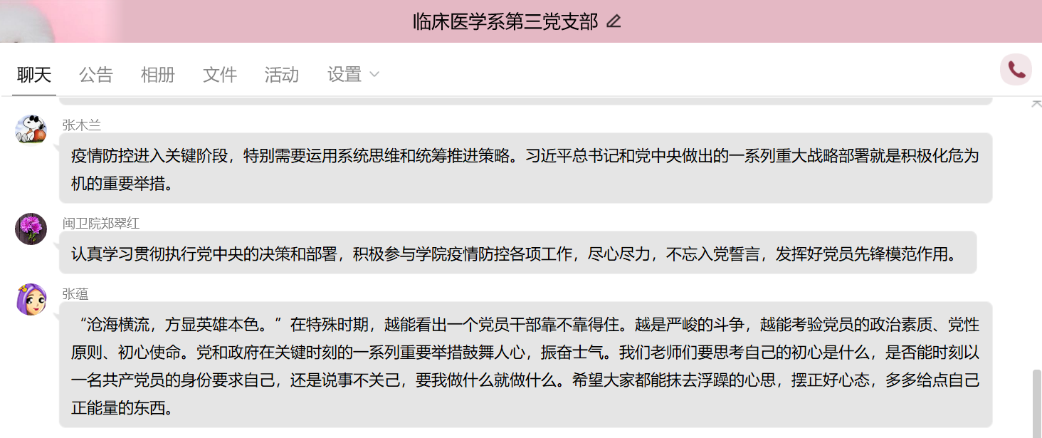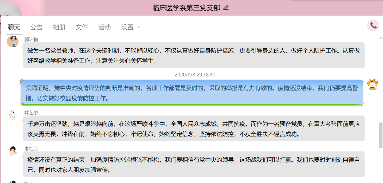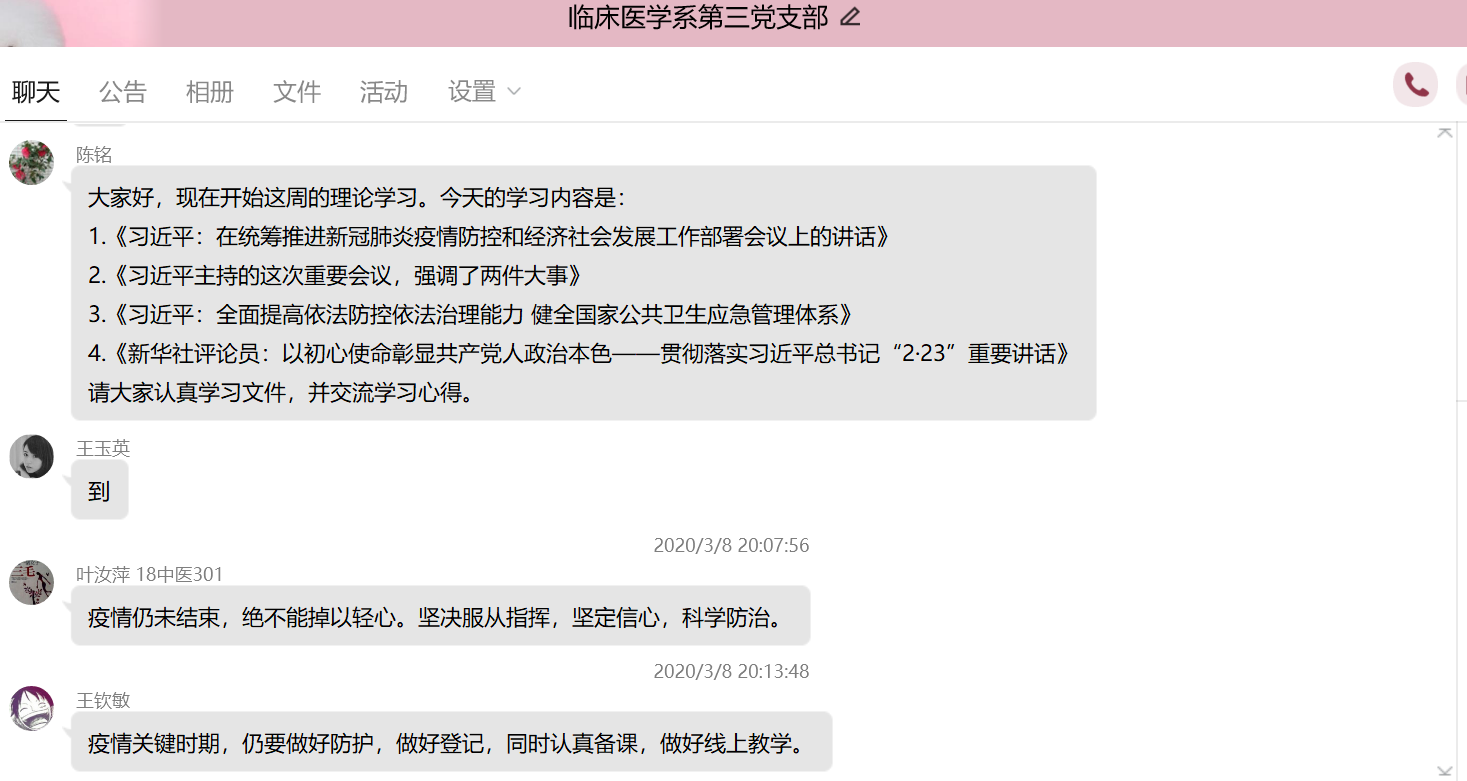 3月8日晚上,臨床醫(yī)學(xué)系第三黨支部利用在線平臺(tái)開展理論學(xué)習(xí),學(xué)習(xí)內(nèi)容為《習(xí)近平:在統(tǒng)籌推進(jìn)新冠肺炎疫情防控和經(jīng)濟(jì)社會(huì)發(fā)展工作部署會(huì)議上的講話》、《習(xí)近平主持的這次重要會(huì)議,強(qiáng)調(diào)了兩件大事》、《習(xí)近平:全面提高依法防控依法治理能力健全國家公共衛(wèi)生應(yīng)急管理體系》、《新華社評(píng)論員:以初心使命彰顯共產(chǎn)黨人政治本色——貫徹落實(shí)習(xí)近平總書記“2·23”重要講話》。此次學(xué)習(xí)由支部書記陳銘同志主持。