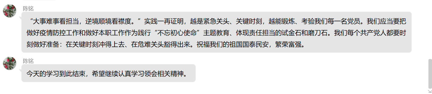 最后由陳銘書記做最后總結(jié),“大事難事看擔(dān)當(dāng),逆境順境看襟度。”實(shí)踐一再證明,越是緊急關(guān)頭、關(guān)鍵時(shí)刻,越能鍛煉、考驗(yàn)我們每一名黨員。我們應(yīng)當(dāng)要把做好疫情防控工作和做好本職工作作為踐行“不忘初心、牢記使命”主題教育、體現(xiàn)責(zé)任擔(dān)當(dāng)?shù)脑嚱鹗湍サ妒?。我們每個(gè)共產(chǎn)黨人都要時(shí)刻做好準(zhǔn)備:在關(guān)鍵時(shí)刻沖得上去、在危難關(guān)頭豁得出來。