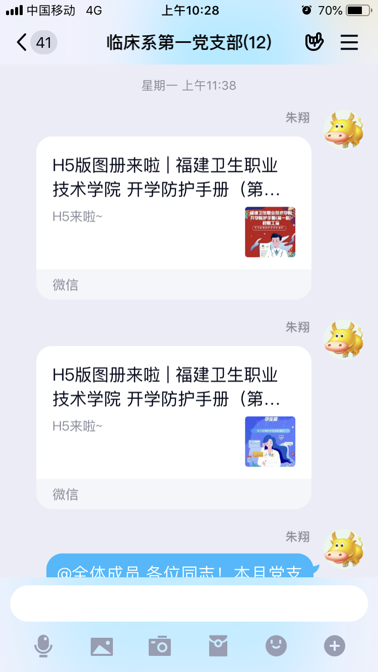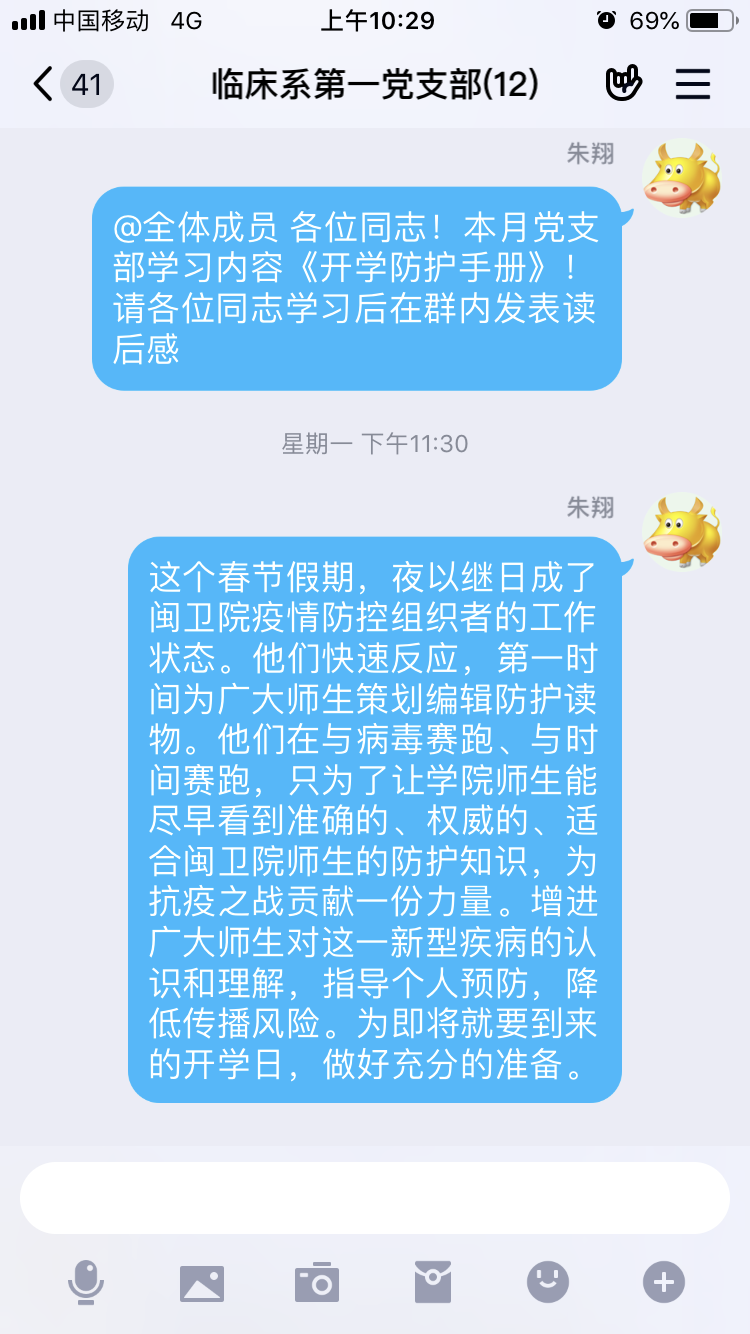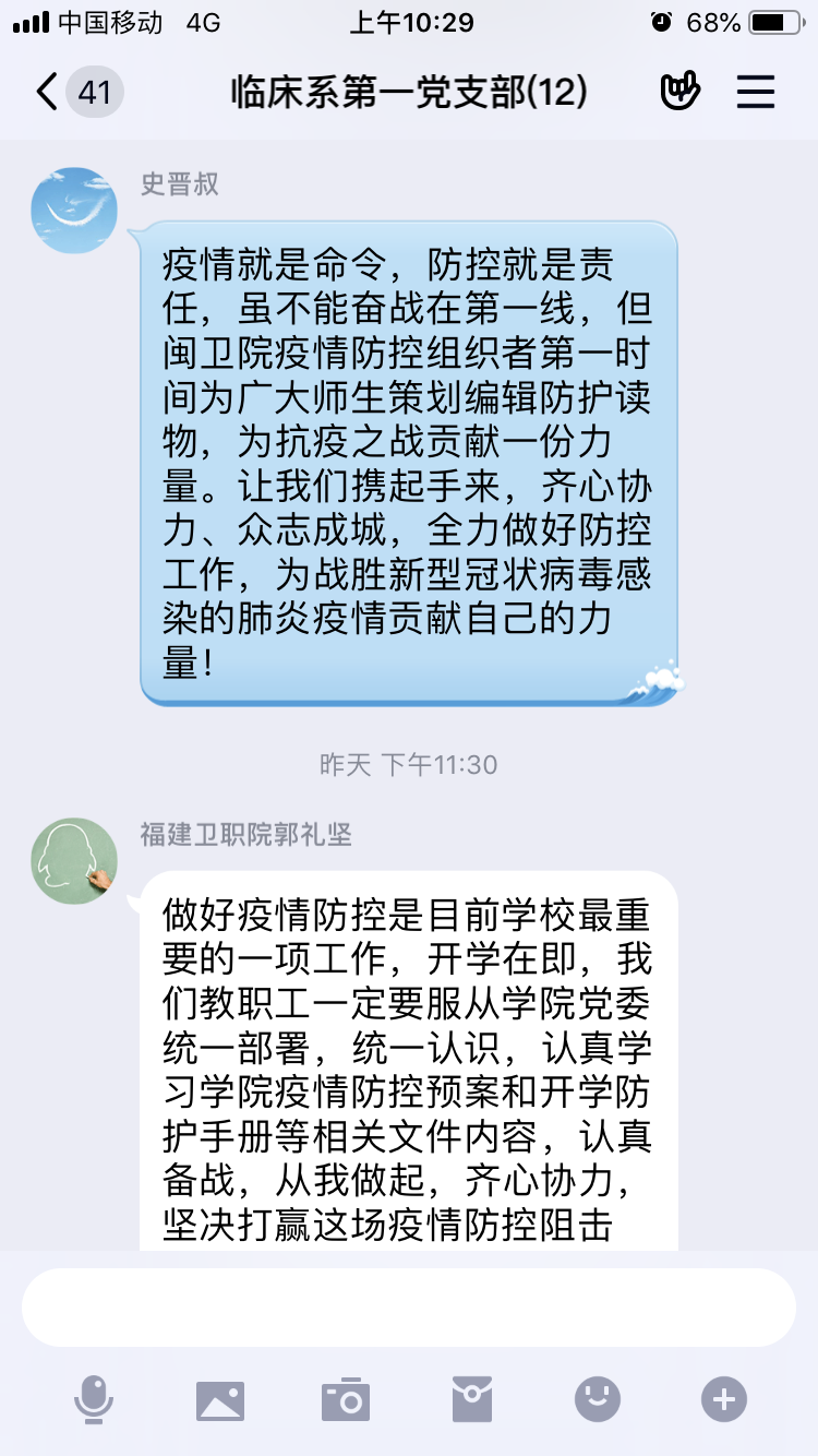 疫情就是命令,防控就是責(zé)任。新冠肺炎疫情發(fā)生以來,臨床系第一黨支部迅速進(jìn)入戰(zhàn)斗狀態(tài),積極組織臨床醫(yī)學(xué)專業(yè)教師黨員開展疫情防控宣傳工作。2月份,第一黨支部充分利用在線平臺開展主題黨日活動(dòng)——學(xué)習(xí)《福建衛(wèi)生職業(yè)技術(shù)學(xué)院 開學(xué)防護(hù)手冊》。