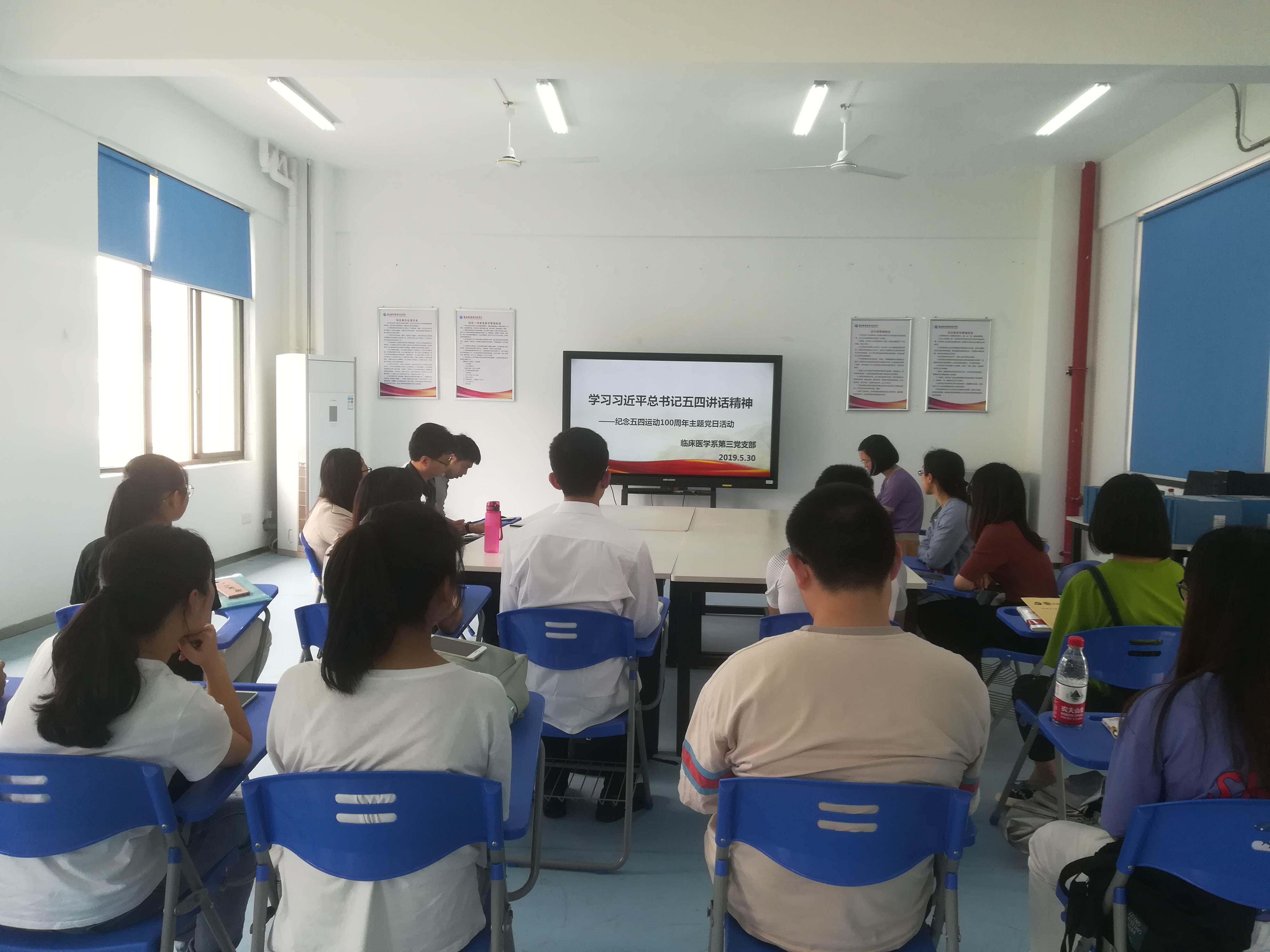 為深入貫徹落實(shí)《中共教育部黨組關(guān)于教育系統(tǒng)認(rèn)真學(xué)習(xí)貫徹習(xí)近平總書記在紀(jì)念五四運(yùn)動(dòng)100周年大會(huì)上重要講話精神的通知》精神,弘揚(yáng)五四精神,落實(shí)立德樹人根本任務(wù),2019年5月30日,臨床醫(yī)學(xué)系第三黨支部組織學(xué)習(xí)了習(xí)近平總書記在紀(jì)念五四運(yùn)動(dòng)100周年大會(huì)上的重要講話精神。會(huì)議由臨床醫(yī)學(xué)系第三黨支部書記陳銘老師主持,支部黨員及部分學(xué)生入黨積極分子參加了本次活動(dòng)。 活動(dòng)首先播放了電影《建黨偉業(yè)》“五四運(yùn)動(dòng)”片段,回顧了五四運(yùn)動(dòng)發(fā)生的背景與過(guò)程。影片中,一個(gè)舉著血書“冤”字的女大學(xué)生跪在總統(tǒng)府前情愿,回答軍警為什么不到檢察廳喊冤時(shí),她含淚說(shuō):“冤情太深,檢察廳接不了我的狀子?!敝笸春?“我是為四萬(wàn)萬(wàn)同胞喊冤啊!”這一聲猶如千鈞之重的巨石狠狠砸在了每一個(gè)人的心上,與會(huì)者無(wú)不被那個(gè)熱血沸騰激情澎湃的時(shí)代所震撼,被那群心系國(guó)家情牽百姓的先驅(qū)所感動(dòng),被那種為國(guó)獻(xiàn)身死而后已的精神折服。隨后,全體黨員教師及學(xué)生入黨積極分子共同學(xué)習(xí)了講話全文,張?zhí)N同志重點(diǎn)宣讀了習(xí)近平總書記重要講話中對(duì)青年人提出的六點(diǎn)希望,并結(jié)合以往教學(xué)過(guò)程中的所見(jiàn)所聞所感發(fā)表了對(duì)青年學(xué)生的看法和期望。接著,2018級(jí)臨床301班周天陽(yáng)同學(xué)代表與會(huì)學(xué)生發(fā)表學(xué)習(xí)感想,表達(dá)了青年永遠(yuǎn)高舉五四精神旗幟,勇敢接力,肩負(fù)起時(shí)代重任的決心。