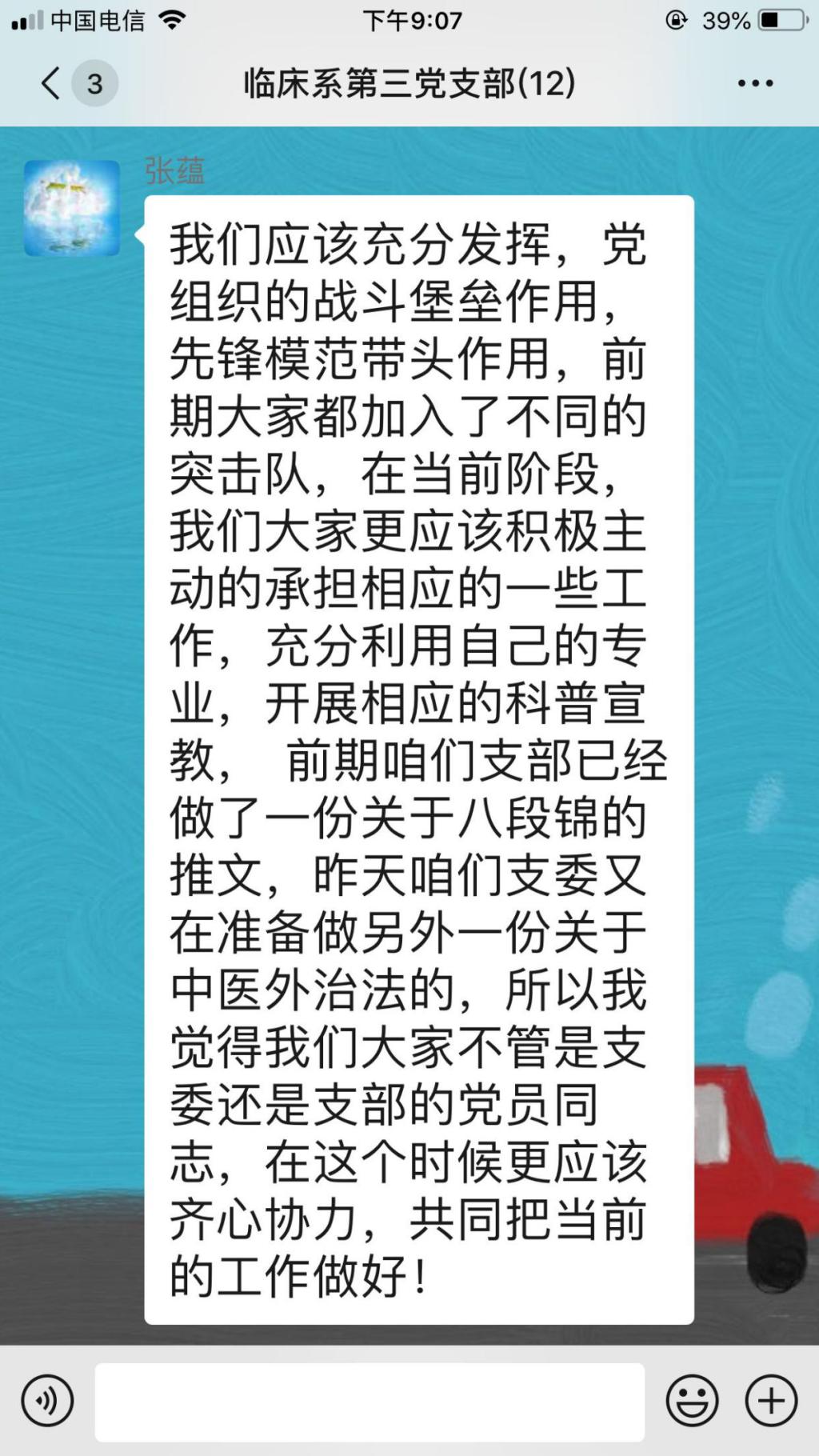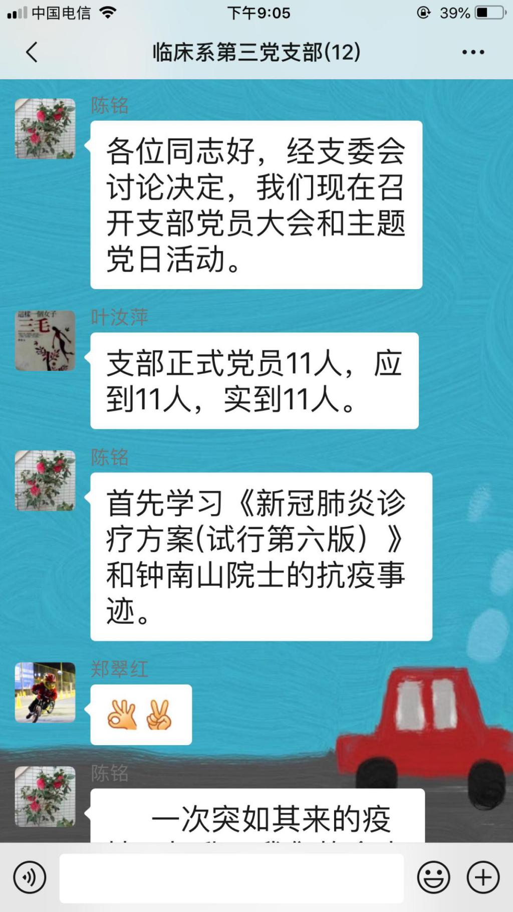 為積極應(yīng)對(duì)新型冠狀病毒感染,幫助支部黨員提高專(zhuān)業(yè)知識(shí)、強(qiáng)化政治意識(shí)。2月21日晚上,臨床醫(yī)學(xué)系第三黨支部利用在線平臺(tái)開(kāi)展學(xué)習(xí)《新冠肺炎診療方案(試行第六版)》和鐘南山院士的抗疫事跡支部大會(huì),全體黨員參加了此次大會(huì)。大會(huì)由支部書(shū)記陳銘同志主持。