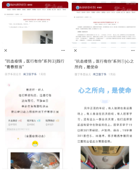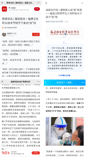 醫(yī)學(xué)系黨總支深入了解學(xué)生在一線抗疫情況,積極向?qū)W院官網(wǎng)、官微推送。學(xué)習(xí)強(qiáng)國、中國青年報(bào)、福建衛(wèi)生報(bào)等主流媒體紛紛轉(zhuǎn)載報(bào)道。