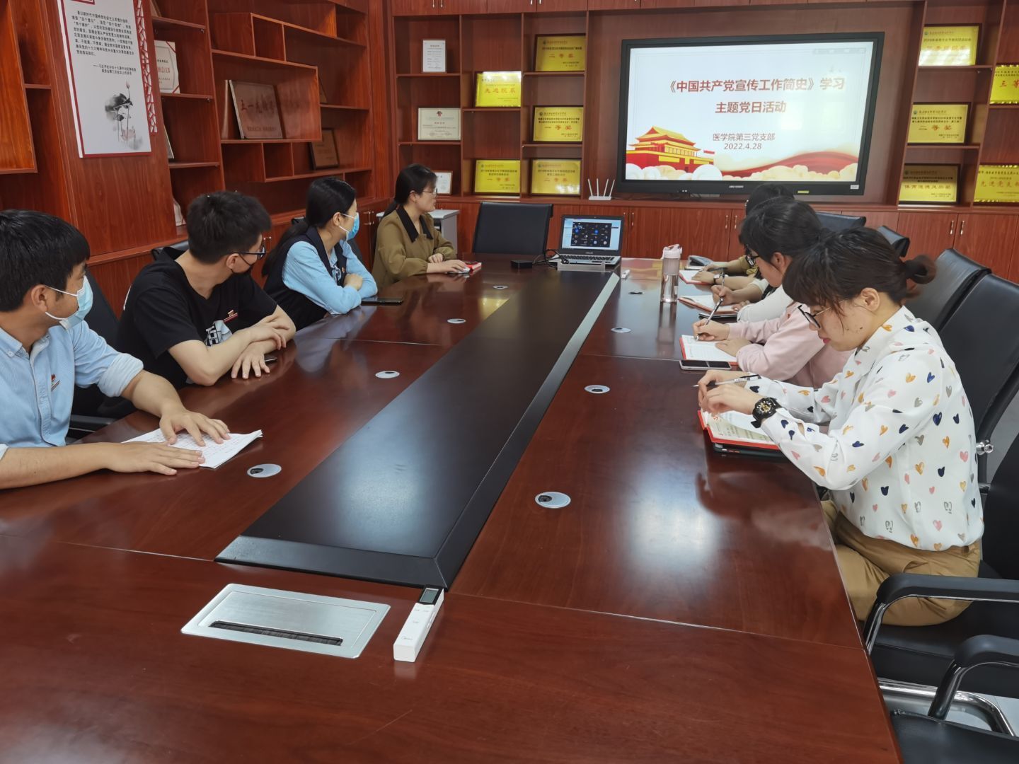 2022年4月29日,醫(yī)學(xué)院第三黨支部以線(xiàn)上線(xiàn)下結(jié)合形式開(kāi)展主題黨日活動(dòng),專(zhuān)題學(xué)習(xí)《中國(guó)共產(chǎn)黨宣傳工作簡(jiǎn)史》(以下簡(jiǎn)稱(chēng)《簡(jiǎn)史》)。本次主題黨日由支部副書(shū)記葉汝萍主持,支部黨員及預(yù)備黨員參加活動(dòng)。