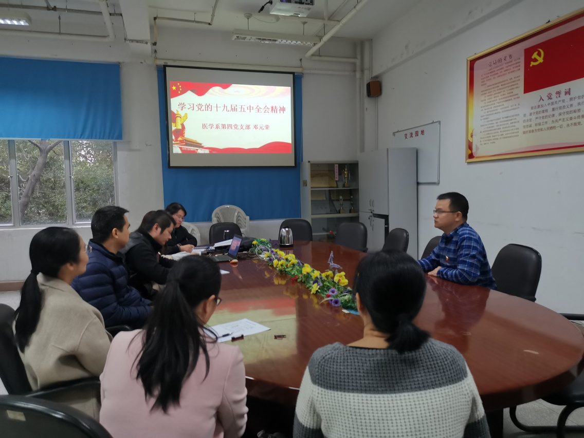 為深入學(xué)習(xí)貫徹黨的十九屆五中全會精神,12月10日下午,醫(yī)學(xué)系第四黨支部書記鄧元榮同志在基礎(chǔ)部會議室為全體黨員開展“學(xué)習(xí)黨的十九屆五中全會精神”為題的黨課。