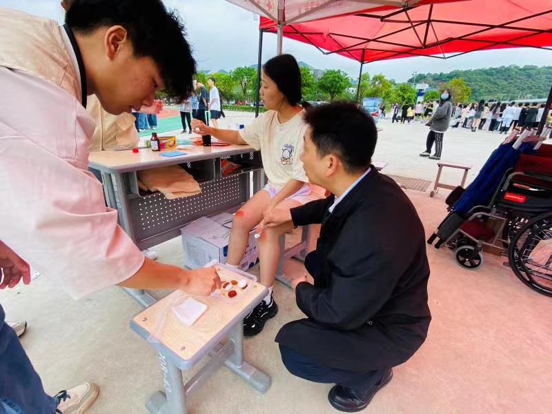 比賽期間,醫(yī)療隊黨員教師及紅十字會志愿者備好應(yīng)急醫(yī)療藥品時刻守護在賽場旁,對發(fā)生運動損傷的運動員第一時間進行醫(yī)療救治。