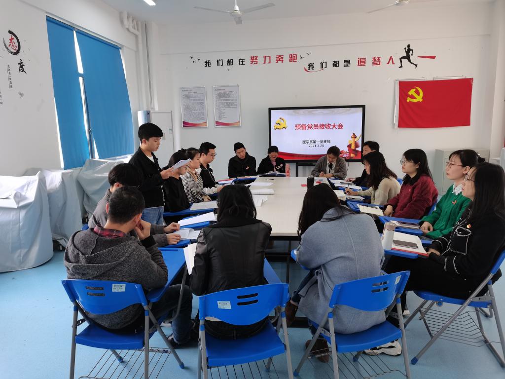 2021年3月25日中午,醫(yī)學(xué)系第一黨支部在實訓(xùn)樓401召開接收預(yù)備黨員大會。會議由支部書記朱翔主持,支部2名教師預(yù)備黨員及11名正式黨員全部參會。