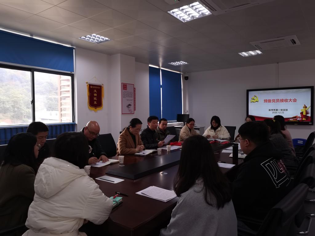 2020年12月22日中午,醫(yī)學系第一黨支部在實訓樓311召開接收預備黨員大會。會議由支部書記朱翔主持,支部11名正式黨員除事假1名,其余10名黨員全部參會。