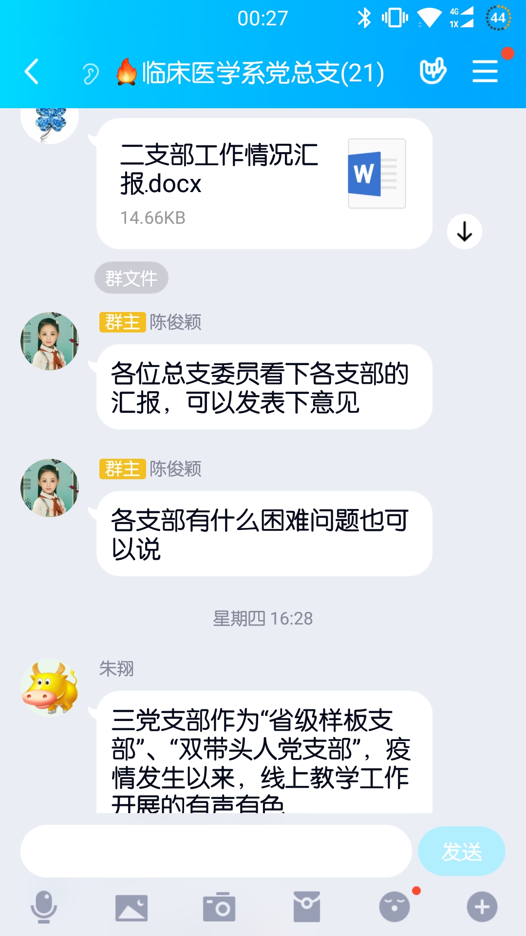 2020年2月27日,臨床醫(yī)學(xué)系黨總支在QQ群召開(kāi)2月份支部書(shū)記例會(huì),會(huì)議由系黨總支負(fù)責(zé)人陳俊穎主持。
