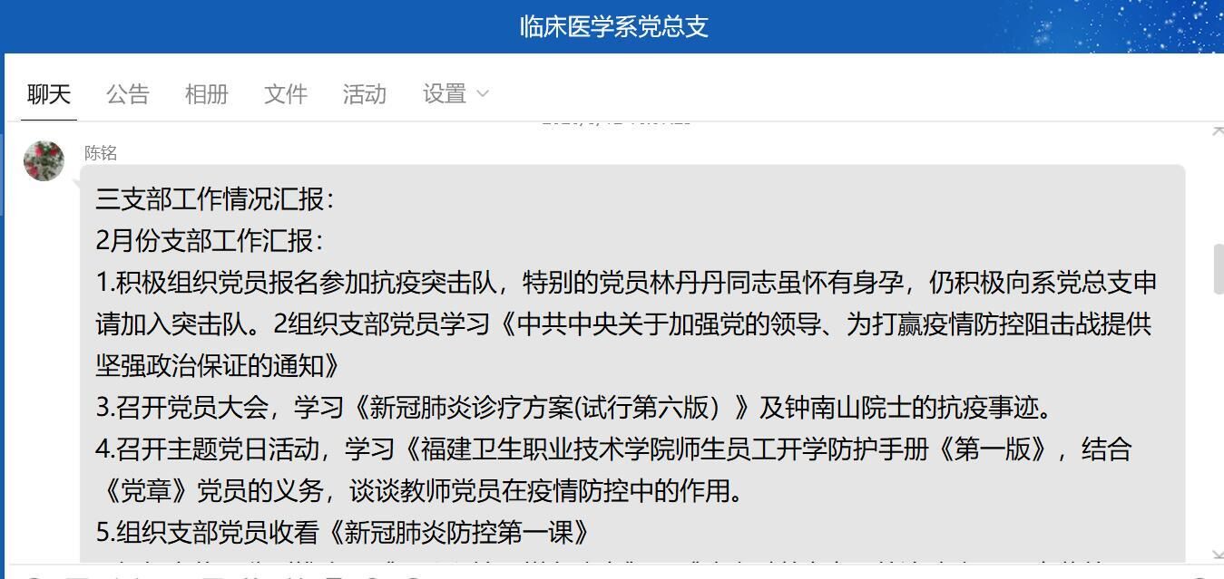 會(huì)上,各支部書(shū)記詳細(xì)匯報(bào)了2月份各項(xiàng)工作開(kāi)展情況。第一黨支部在分管領(lǐng)導(dǎo)鄭翠紅副校長(zhǎng)帶領(lǐng)下,由臨床醫(yī)學(xué)系黨總支部牽頭,一支部具體負(fù)責(zé),藥學(xué)系第二黨支部協(xié)助,于2月10日組建了由22位黨員及部分入黨積極分子、志愿者組成的閩衛(wèi)院黨員衛(wèi)生防疫突擊隊(duì),積極參與學(xué)院的各項(xiàng)防疫工作。制定開(kāi)學(xué)后,防控新冠肺炎期間,門(mén)診部工作計(jì)劃安排,第一黨支部執(zhí)業(yè)醫(yī)師注冊(cè)門(mén)診部的黨員教師全體參與臨床一線工作。第二黨支部組織支部黨員同志積極參與黨員突擊隊(duì),支部各位黨員各司其職,通過(guò)QQ群、微信群,向?qū)W生及時(shí)傳達(dá)學(xué)院有關(guān)防疫工作的重要會(huì)議、文件精神與防疫知識(shí);每天定時(shí)上報(bào)實(shí)習(xí)生和在校生去向及健康情況,及時(shí)了解學(xué)生動(dòng)態(tài),跟蹤異常學(xué)生情況。開(kāi)展線上主題班會(huì)進(jìn)行防疫知識(shí),防騙教育,關(guān)注學(xué)生心理健康,了解困難學(xué)生情況,宣傳學(xué)校關(guān)于受疫情影響的補(bǔ)助政策,及時(shí)提供幫助。并收集校友、系部師生的戰(zhàn)“疫” 事跡,做好宣傳工作。第三黨支部積極組織黨員報(bào)名參加抗疫突擊隊(duì),特別的黨員林丹丹同志雖懷有身孕,仍積極向系黨總支申請(qǐng)加入突擊隊(duì)。并利用中醫(yī)專(zhuān)業(yè)優(yōu)勢(shì)組織宣傳,分別推出了《習(xí)八段錦,增免疫力》、《防疫科普 | 中醫(yī)外治防疫——中藥外用篇》和《【防疫科普 | 中醫(yī)外治防疫——“六字訣"篇》專(zhuān)題。