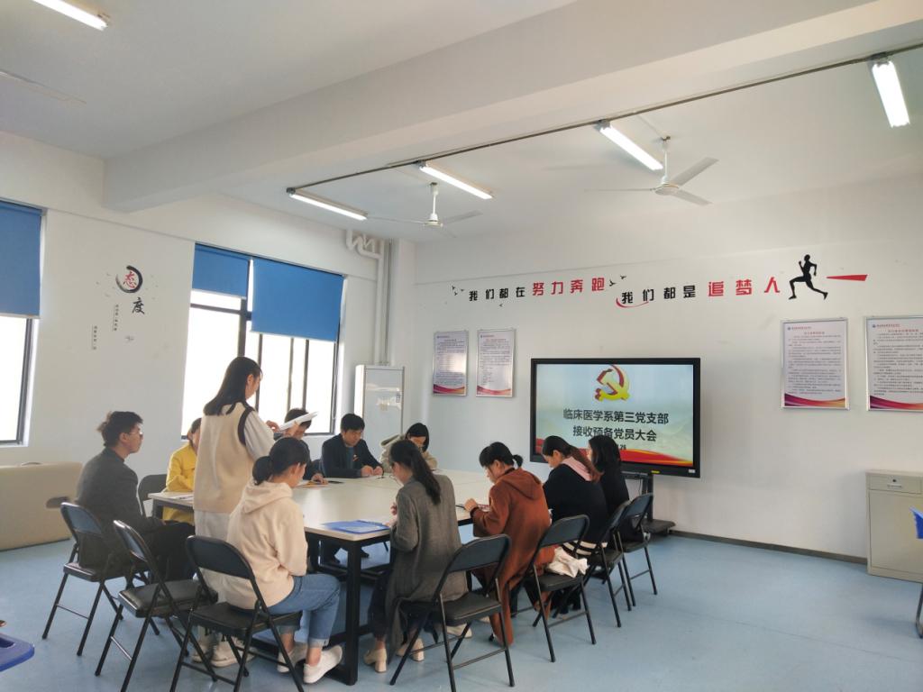 2019年12月26日下午,臨床醫(yī)學(xué)系第三黨支部在實(shí)訓(xùn)樓401室召開接收預(yù)備黨員大會。會議由支部書記陳銘主持,支部11名正式黨員除產(chǎn)假1人,事假2人,其余8名黨員全部參會。
