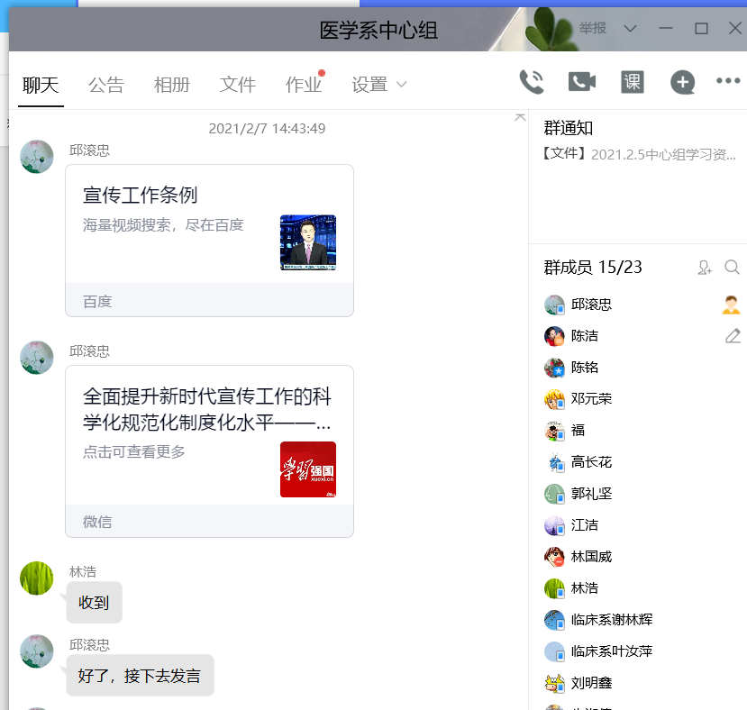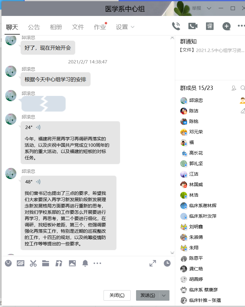 2月7日下午,醫(yī)學系在線召開黨總支理論學習中心組(擴大)會議,學習福建省十三屆人大五次會議和省政協(xié)十二屆四次會議和省政府第一次全體會議精神、福建省委書記尹力同志在省管干部學習貫徹黨的十九屆五中全會精神研討班開班式上的講話、福建省第十屆紀律檢查委員會第六次全體會議決議、《中國共產黨宣傳工作條例》等內容。