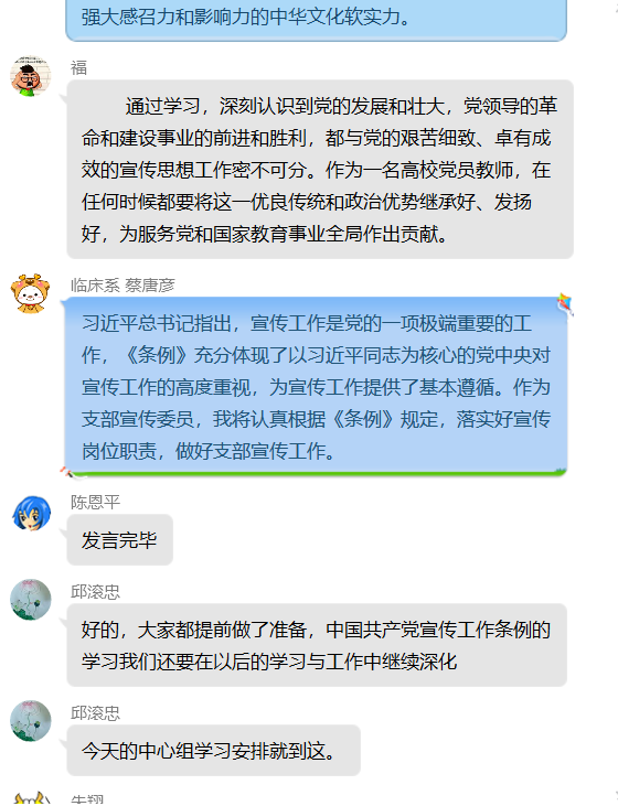 系黨總支宣傳委員陳銘、紀檢委員鄧元榮分別做了主題發(fā)言。圍繞《中國共產黨宣傳工作條例》的內容,結合自身的崗位職責以及學院新一輪建設目標,深入地解讀了《條例》的精神和要求,為大家進一步學習《條例》提供指導。隨后,各黨支部宣傳委員也紛紛分享了學習體會。