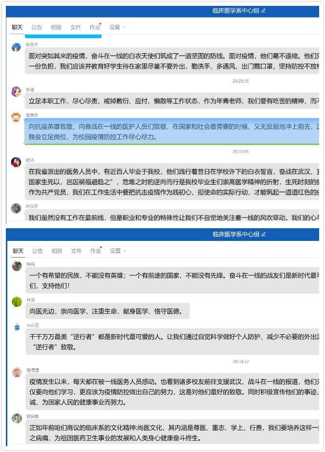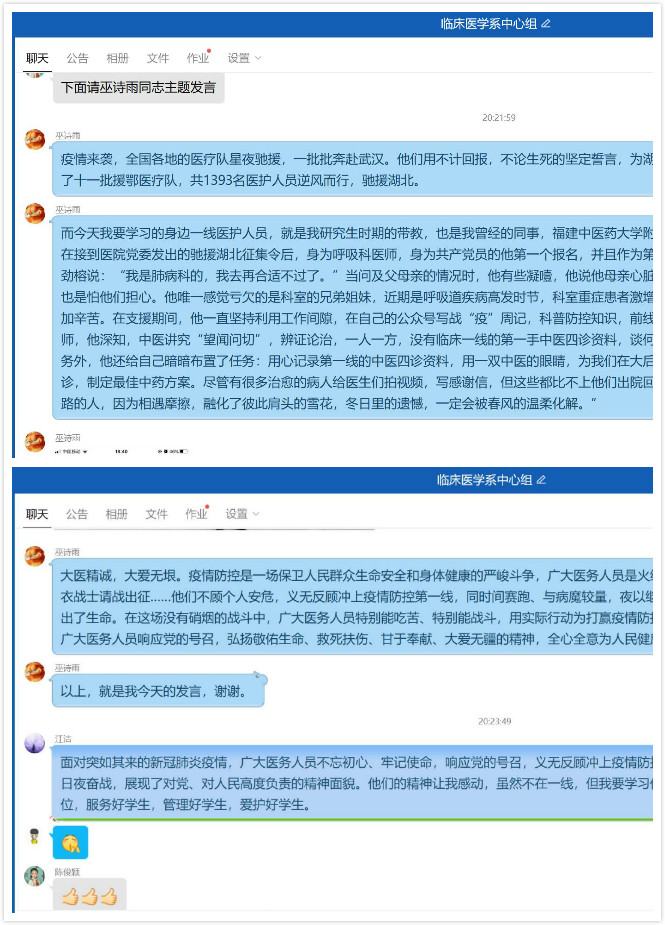正值疫情暴發(fā)期間,中心組成員在家抗疫仍不忘學(xué)習(xí)。會(huì)中,巫詩(shī)雨做主題發(fā)言,她講述了福建中醫(yī)藥大學(xué)附屬人民醫(yī)院肺病科副主任醫(yī)師林勁榕主任的優(yōu)秀事跡。一月份在接到醫(yī)院黨委發(fā)出的馳援湖北征集令后,身為呼吸科醫(yī)師,身為共產(chǎn)黨員的林勁榕主任第一個(gè)報(bào)名,并且作為第一批援鄂醫(yī)療隊(duì)成員,赴武漢金銀潭醫(yī)院支援。在支援期間,他一直堅(jiān)持利用工作間隙,在自己的公眾號(hào)寫戰(zhàn)“疫”周記,科普防控知識(shí),前線動(dòng)態(tài),以及診療心得。他說(shuō)“我們都是飛雪中趕路的人,因?yàn)橄嘤瞿Σ?,融化了彼此肩頭的雪花,冬日里的遺憾,一定會(huì)被春風(fēng)的溫柔化解?!?在這場(chǎng)沒有硝煙的戰(zhàn)斗中,廣大醫(yī)務(wù)人員特別能吃苦、特別能戰(zhàn)斗,用實(shí)際行動(dòng)為打贏疫情防控阻擊戰(zhàn)筑牢了生命防線、提供了專業(yè)支撐。我國(guó)廣大醫(yī)務(wù)人員響應(yīng)黨的號(hào)召,弘揚(yáng)敬佑生命、救死扶傷、甘于奉獻(xiàn)、大愛無(wú)疆的精神,全心全意為人民健康服務(wù),值得我們學(xué)習(xí)。