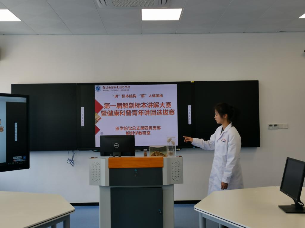 福建衛(wèi)生職業(yè)技術(shù)學(xué)院第一屆解剖標(biāo)本講解大賽在醫(yī)學(xué)院全新的解剖學(xué)實(shí)訓(xùn)室拉開(kāi)帷幕。校團(tuán)委林桂松書(shū)記、醫(yī)學(xué)院鄧元榮副院長(zhǎng)蒞臨現(xiàn)場(chǎng)指導(dǎo),醫(yī)學(xué)院黨總支第四黨支部黨員教師、解剖學(xué)教研室教師擔(dān)任此次比賽的評(píng)委。
