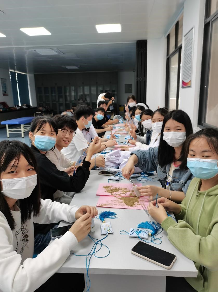 聽完老師的講解后,同學(xué)們對中藥材神奇功效的認(rèn)知得到了驗證與加深,產(chǎn)生了更濃厚的興趣。大家三倆成組,相互配合,將已打磨成藥粉的中藥材放入囊袋之中,并扎緊固定起來。在老師細(xì)心的指導(dǎo)與同學(xué)的配合下,一個個飽滿又精致的中藥香囊呈現(xiàn)在大家眼前,空氣中彌漫著清幽的香氣。“戴個香草袋,不怕五毒害”,端午節(jié)這天,佩戴香囊,不但有避邪驅(qū)瘟之意,又有襟頭點(diǎn)綴之風(fēng)。傳統(tǒng)節(jié)日“端午”將至,同學(xué)們對親手制作如此“應(yīng)景”的藥囊愛不釋手。