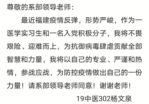 9月10日以來,新冠肺炎疫情突襲福建,三十余名醫(yī)學(xué)系實(shí)習(xí)生請(qǐng)?jiān)副几?“疫”線,他們當(dāng)中閃耀著這樣一群可愛的身影,他們不是黨員,卻和黨員一樣敢于擔(dān)當(dāng)、沖鋒在前,用實(shí)際行動(dòng)踐行著初心使命,用無私無畏表明入黨的決心,向黨組織作最深刻的思想?yún)R報(bào)。他們就是醫(yī)學(xué)系入黨積極分子們。