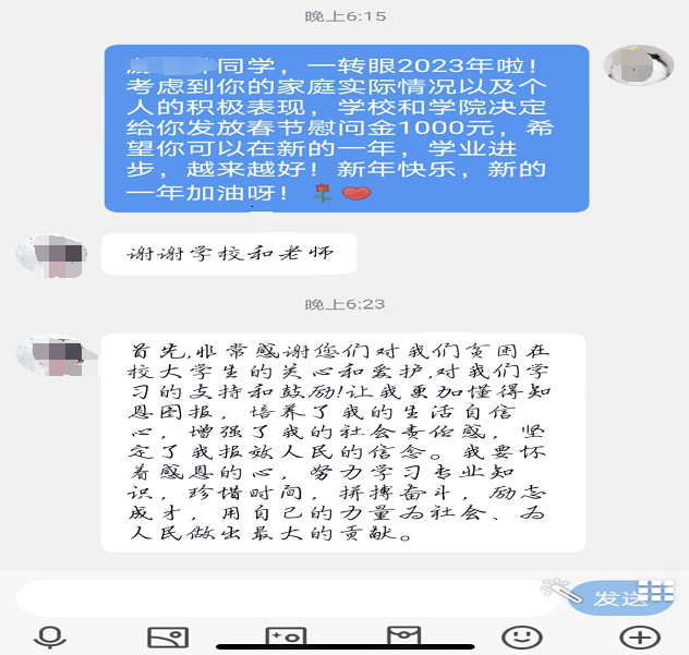 歲寒情深,為把黨和國家對家庭經(jīng)濟(jì)困難學(xué)生的關(guān)懷落到實處,2022年12月29號,醫(yī)學(xué)院領(lǐng)導(dǎo)、全體輔導(dǎo)員通過線上、線下開展“迎新春,送溫暖”活動,為學(xué)生送上親切的關(guān)懷和慰問金,同時就學(xué)生的家庭生活、學(xué)習(xí)等方面與同學(xué)們暖心交流。