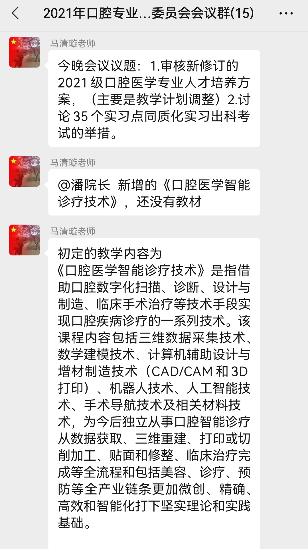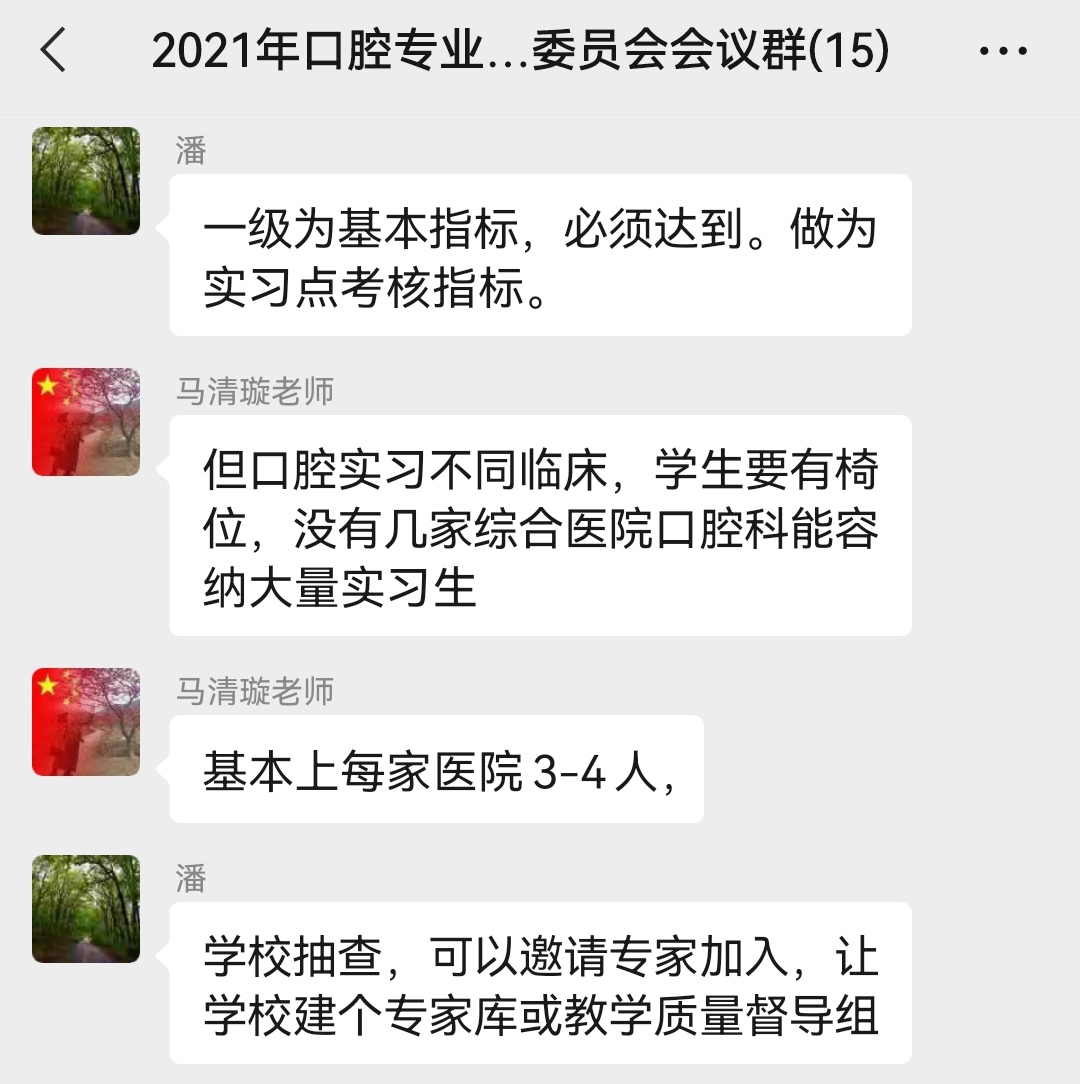 為進(jìn)一步加強(qiáng)口腔醫(yī)學(xué)專業(yè)建設(shè),提升口腔醫(yī)學(xué)專業(yè)人才培養(yǎng)質(zhì)量,9月30日,2021年醫(yī)學(xué)系口腔醫(yī)學(xué)專業(yè)指導(dǎo)委員會(huì)召開(kāi)例會(huì),會(huì)議采用線上微信群聊的方式開(kāi)展。