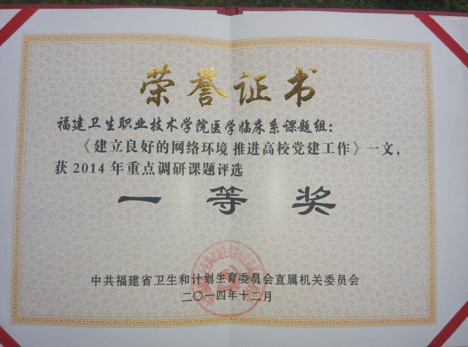 在2014年中共福建省衛(wèi)生和計(jì)劃生育委員會(huì)直屬機(jī)關(guān)委員會(huì)組織的重點(diǎn)調(diào)研課題評(píng)選活動(dòng)中,我系邱滾忠書(shū)記指導(dǎo)的課題《建立良好的網(wǎng)絡(luò)環(huán)境 推進(jìn)高校黨建工作》榮獲一等獎(jiǎng)。