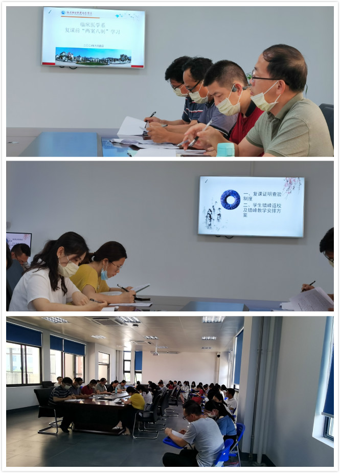 2020年6月4日下午,臨床醫(yī)學(xué)系組織全體教職工認(rèn)真學(xué)習(xí)了學(xué)院制訂的“兩案八制”中的《學(xué)生錯(cuò)峰返校及錯(cuò)峰教學(xué)安排方案》、《復(fù)課證明查驗(yàn)制度》。通過學(xué)習(xí),熟悉了如何規(guī)范處置課堂突發(fā)情況等的流程,以及復(fù)課證明辦理手續(xù)等內(nèi)容,為迎接即將到來的學(xué)生返校工作,做好充分的準(zhǔn)備。