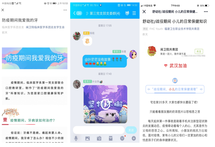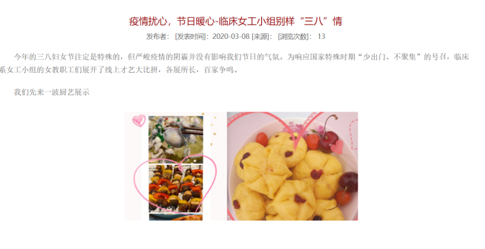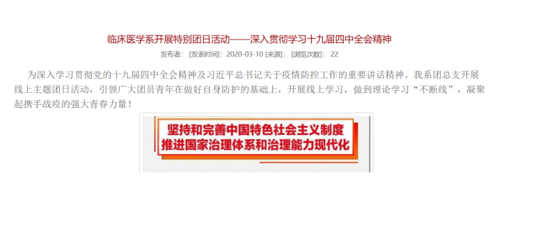 一、宣傳教育組:1.組織各支部黨員加強(qiáng)理論學(xué)習(xí),深入貫徹落實(shí)習(xí)近平總書記重要講話精神,并對相關(guān)學(xué)習(xí)情況進(jìn)行及時掛網(wǎng);2.對青年學(xué)生團(tuán)員學(xué)習(xí)十九屆四中全會精神的情況進(jìn)行宣傳報道;3.“全國大學(xué)生同上一堂疫情防控思政大課”;4.對系部女職工開展別樣的“宅家”慶?;顒舆M(jìn)行宣傳報道;5. 通過QQ群、微信群、團(tuán)學(xué)公眾號等向師生宣傳防疫知識等。