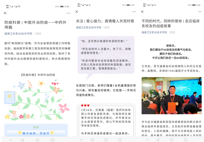 一、宣傳教育組:1.通過(guò)QQ群、微信群、團(tuán)學(xué)公眾號(hào)等向師生及時(shí)傳達(dá)學(xué)院有關(guān)防疫工作的重要會(huì)議、文件精神與防疫知識(shí)。2.對(duì)接相關(guān)支部,充分發(fā)揮專業(yè)特色,制作中醫(yī)藥的防疫宣傳工作。3.對(duì)臨床系團(tuán)總支組織學(xué)生線上學(xué)習(xí)習(xí)近平總書(shū)記回信精神進(jìn)行宣傳報(bào)道。4.對(duì)教師集中學(xué)習(xí)黨的十九屆四中全會(huì)精神集進(jìn)行宣傳報(bào)道。5.對(duì)衛(wèi)生防疫組聯(lián)合門(mén)診部開(kāi)展捐贈(zèng)活動(dòng)進(jìn)行宣傳報(bào)道。6.對(duì)臨床醫(yī)學(xué)系校友抗擊疫情的故事進(jìn)行宣傳報(bào)道。