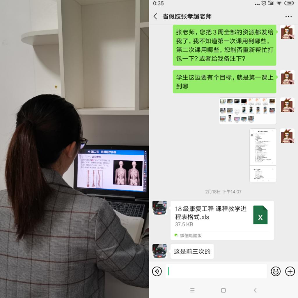 在教學(xué)之余,作為康復(fù)專業(yè)多門(mén)課程的教輔人員,保證外聘教師正常有序地完成線上授課是她的日常工作。從授課計(jì)劃的制定,到教學(xué)資源的準(zhǔn)備,從平臺(tái)的挑選、學(xué)習(xí)使用,到最后線上授課的實(shí)施,用她的話來(lái)說(shuō),可比自己上課累多了,但為了疫情當(dāng)前“停課不停教、停課不停學(xué)、教學(xué)不縮水”,辛苦都是值得的。