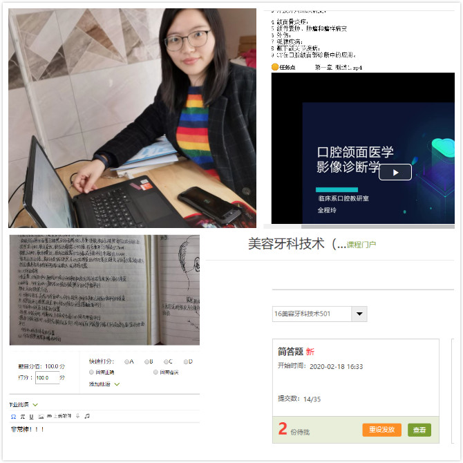 為了順利開(kāi)展教學(xué)工作,全老師提前自學(xué)了騰訊課堂和學(xué)習(xí)通軟件。在學(xué)習(xí)通平臺(tái)上設(shè)置課程框架和教學(xué)環(huán)節(jié),設(shè)計(jì)課程PPT、題庫(kù),錄制并上傳視頻、案例材料等相關(guān)學(xué)習(xí)資料,提前發(fā)布課程電子教材,布置課前預(yù)習(xí),讓學(xué)生及時(shí)獲取本節(jié)課的課堂安排和教學(xué)任務(wù),順利完成《口腔頜面影像學(xué)》、《美容牙科技術(shù)》等考查課的教學(xué)工作。采用”QQ直播+學(xué)習(xí)通”進(jìn)行《口腔內(nèi)科學(xué)》線上教學(xué),實(shí)現(xiàn)“線下學(xué)生自學(xué)”和“線上師生互動(dòng)”教學(xué)模式的互補(bǔ)優(yōu)勢(shì)。 為了調(diào)動(dòng)學(xué)生的學(xué)習(xí)積極性,及時(shí)掌握學(xué)生的學(xué)習(xí)狀態(tài),全老師還摸索出一些小技巧:如組建輔助授課的學(xué)習(xí)通群,布置在線測(cè)試,跟蹤同學(xué)們的記錄并及時(shí)提出表?yè)P(yáng)和提醒,通過(guò)近兩周的運(yùn)行,由于課程資源豐富、環(huán)節(jié)設(shè)計(jì)合理、授課手段多樣,全老師的線上課程平臺(tái)反饋的學(xué)生兩周時(shí)間學(xué)習(xí)點(diǎn)擊率已經(jīng)達(dá)三千多,雖然線上授課比平時(shí)上課準(zhǔn)備工作還要累,但是看到同學(xué)們能夠克服疫情影響,通過(guò)網(wǎng)絡(luò)開(kāi)展學(xué)習(xí)、接受知識(shí),同時(shí)自己在摸索中也提升了信息化教學(xué)水平, 她覺(jué)得這些付出是值得的。