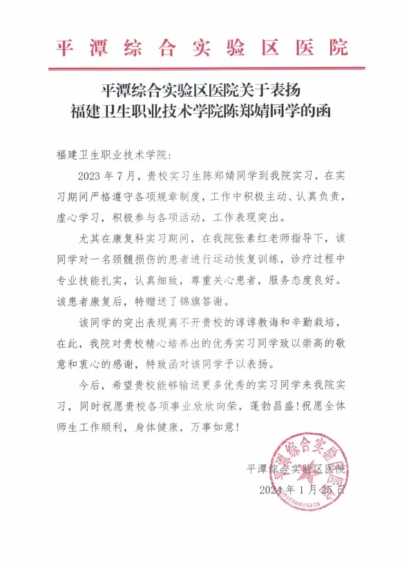2024年1月25日,我校醫(yī)學(xué)院收到了一封來(lái)自學(xué)生實(shí)習(xí)單位平潭綜合實(shí)驗(yàn)區(qū)醫(yī)院的表?yè)P(yáng)信,對(duì)在該醫(yī)院實(shí)習(xí)的陳鄭婧同學(xué)給予了高度評(píng)價(jià)。在實(shí)習(xí)期間,陳鄭婧同學(xué)服從實(shí)習(xí)醫(yī)院安排,并以最佳的精神狀態(tài)融入實(shí)習(xí)工作,在自己的崗位上兢兢業(yè)業(yè),將理論與實(shí)際緊密結(jié)合,高標(biāo)準(zhǔn)完成任務(wù)。