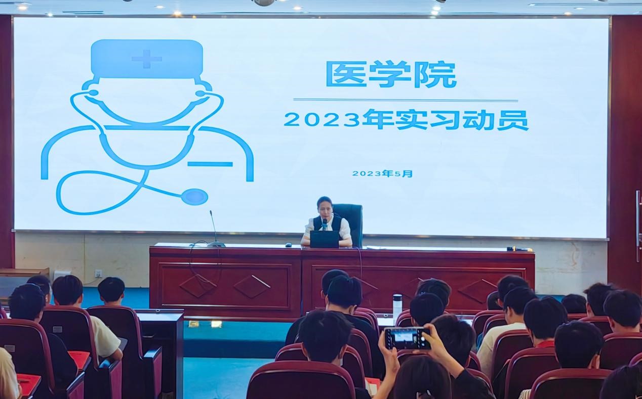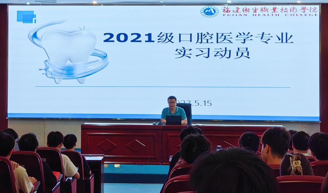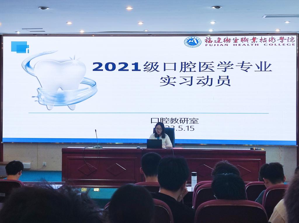 醫(yī)學(xué)院于5月15日在實訓(xùn)樓報告廳開展2021級口腔醫(yī)學(xué)專業(yè)學(xué)生實習動員大會,醫(yī)學(xué)院副院長鄧元榮、黨總支副書記陳潔、口腔醫(yī)學(xué)專業(yè)教研室主任全程玲、輔導(dǎo)員吳曉欣及21級口腔專業(yè)121名學(xué)生參加了此次動員大會。