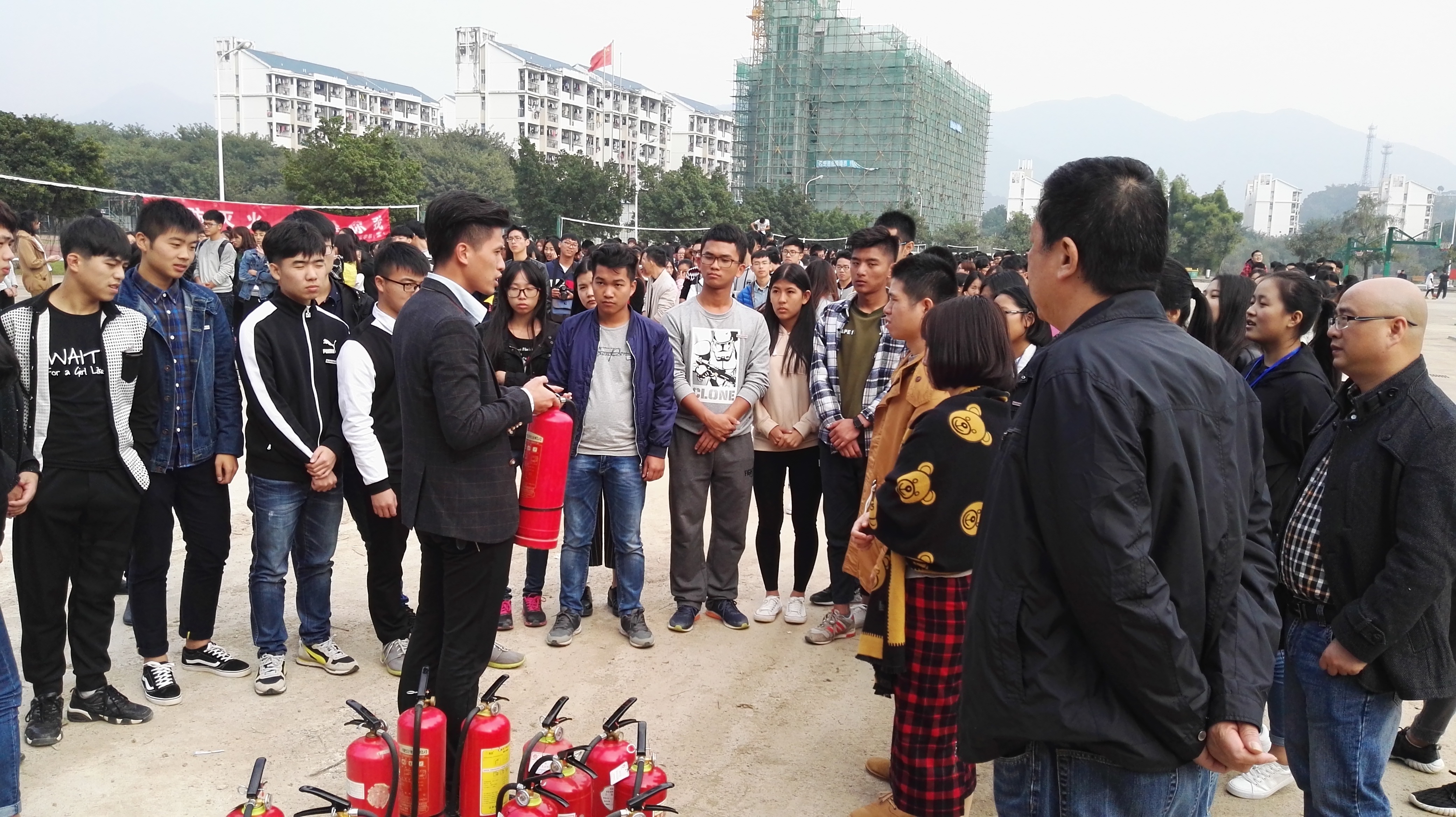 為了提高同學們消防安全意識,營造校園穩(wěn)定良好的安全環(huán)境,我系于2016年12月6日下午在籃球場開展了消防演練活動。系黨總支書記邱滾忠、黨群辦主任曾婷婷、團總支書記陳恩平、團總支副書記葉家濤、輔導(dǎo)員黃惠龍、陳清清及系部新教師和16級全體新生參與了活動,學院保衛(wèi)處老師蒞臨現(xiàn)場指導(dǎo)。