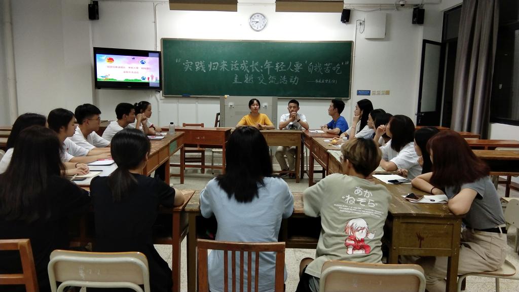 為不斷深化習(xí)近平新時(shí)代中國(guó)特色社會(huì)主義思想的學(xué)思踐悟,響應(yīng)組織青年學(xué)生結(jié)合社會(huì)實(shí)踐學(xué)習(xí),9月15日晚,我系團(tuán)總支于教學(xué)樓305開(kāi)展了一場(chǎng)“實(shí)踐歸來(lái)話(huà)成長(zhǎng):年輕人要‘自討苦吃’”主題交流活動(dòng)。團(tuán)總支陳清清老師、謝林輝老師以及三下鄉(xiāng)各隊(duì)伍成員參加了此次交流會(huì)。
