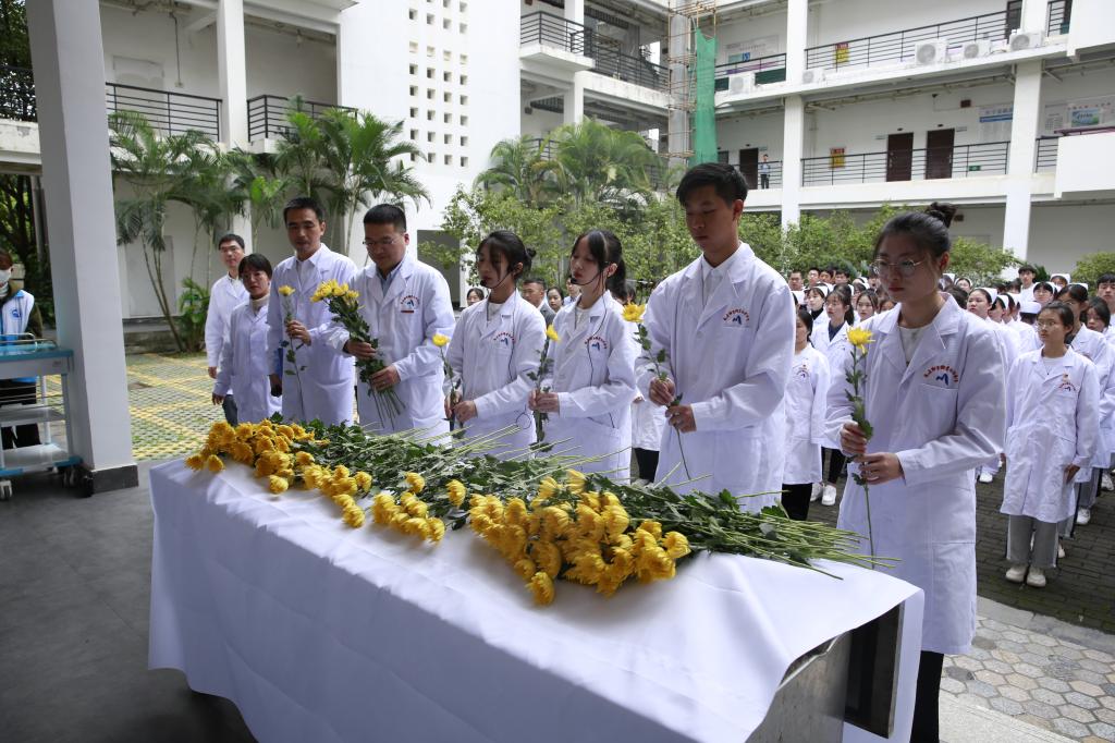 參加活動(dòng)的支部黨員與志愿者精心策劃、各展所長(zhǎng)?;顒?dòng)伊始,醫(yī)學(xué)系第四黨支部書記鄧元榮開講微黨課。隨后,黨員教師袁婕帶領(lǐng)全體參加人員進(jìn)行解剖學(xué)誓詞宣誓。其他黨員教師帶領(lǐng)全體領(lǐng)導(dǎo)、師生向大體老師鞠躬并敬獻(xiàn)鮮花,鄭重留言簽名表明心志,表達(dá)心中的感動(dòng)和對(duì)這些默默奉獻(xiàn)者的追思與感念。