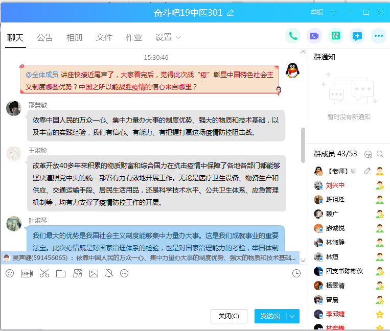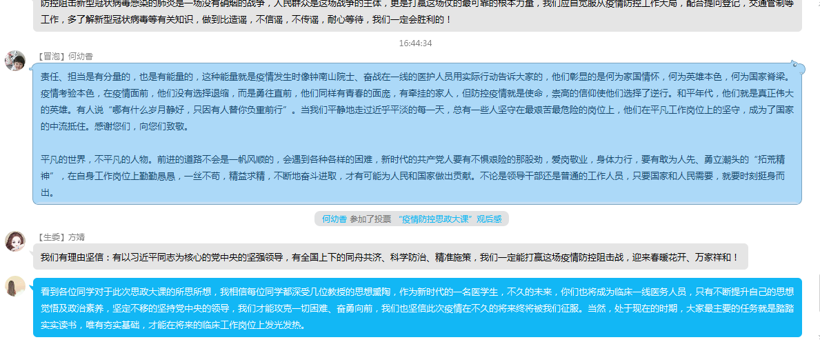 課程結(jié)束,同學們反響熱烈,在輔導員及班委的組織下同學們在線上進行了積極討論。