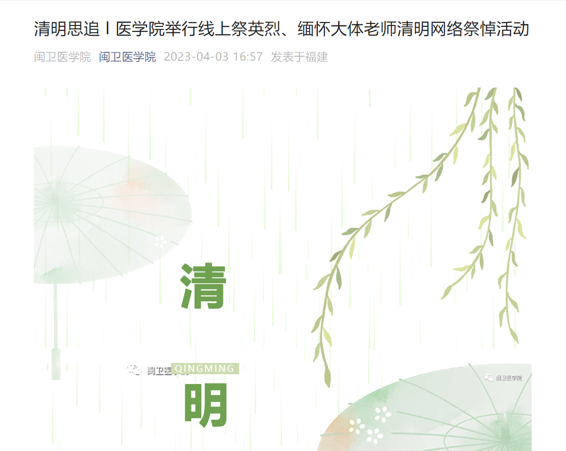 本次清明專題紀(jì)念活動前期,醫(yī)學(xué)院教師第二黨支部、醫(yī)學(xué)院團(tuán)總支開展線上祭英烈、緬懷大體老師清明網(wǎng)絡(luò)祭悼活動,并制作了追思推文,發(fā)布于醫(yī)學(xué)院公眾號,號召同學(xué)們一同學(xué)習(xí)緬懷。線上線下同步推廣,擴(kuò)大了活動的參與面,讓更多的同學(xué)一同撫今追昔思奮進(jìn)。