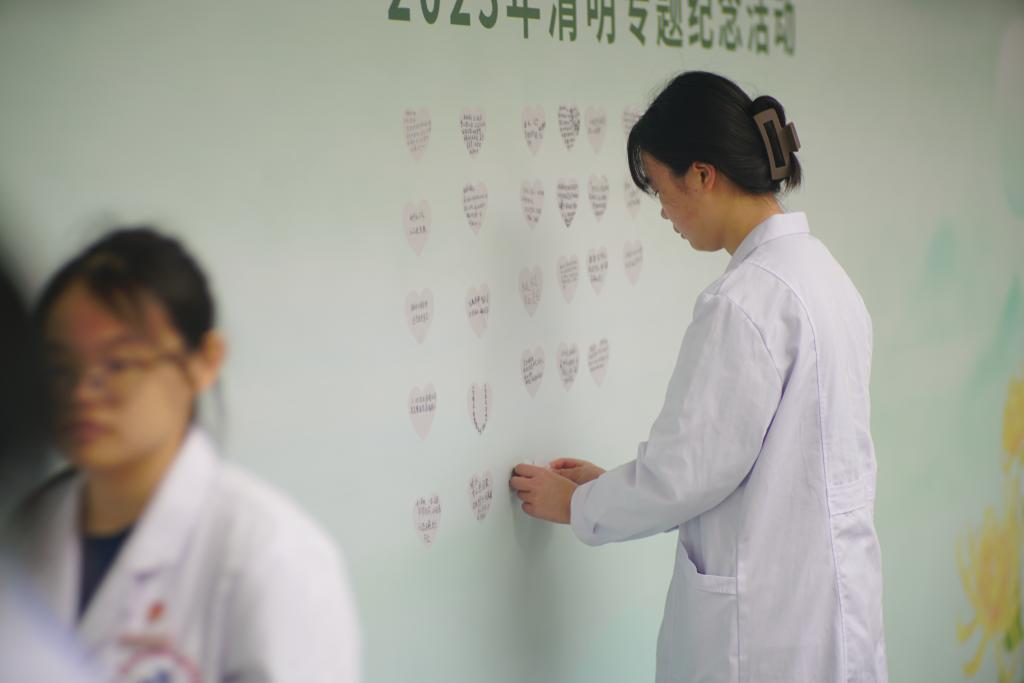 隨后,師生們向大體老師鞠躬、敬獻(xiàn)鮮花,并在追思墻上寄語留言。“大愛無言、感念在心!”“謝謝無言良師照亮醫(yī)學(xué)生前進(jìn)的道路!”有力的筆跡,是每位同學(xué)心中的一份堅(jiān)定,是獲得的一份力量!