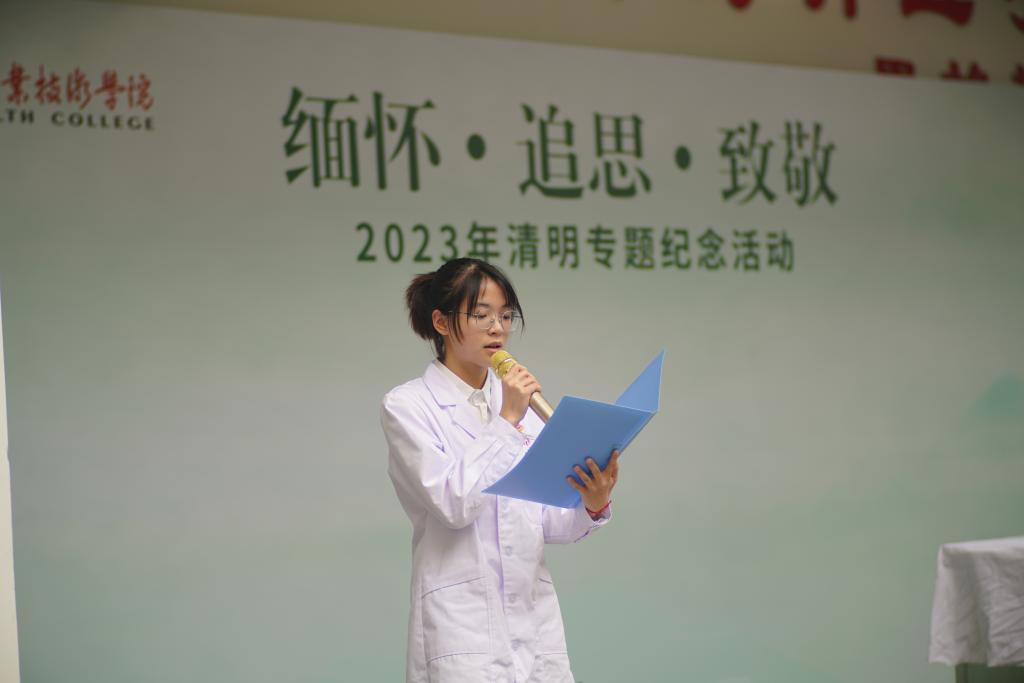 活動現(xiàn)場氣氛莊嚴(yán)、肅穆。主持人飽含深情地介紹在傳統(tǒng)節(jié)日清明節(jié)開展追思活動的重要意義,全體師生集體行默哀禮,緬懷先賢。隨后,伴著緩緩的輕音樂,散文詩朗誦《緬懷?追思?致敬》喚起大家濃濃的思緒,表達(dá)了對無言良師的敬佩與感激。醫(yī)學(xué)院學(xué)生代表還分享了《長征中走出的紅色軍醫(yī)——徐根竹》的事跡,帶領(lǐng)大家在故事中感悟“紅醫(yī)精神”。